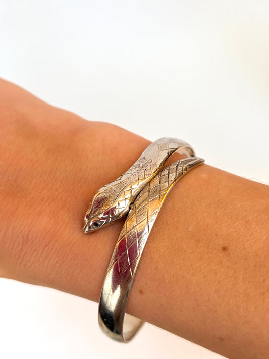 Vintage, Sterling Silver, Garnet Eyed Snake Bangle, 29.21g, Hallmarked London, 1972
