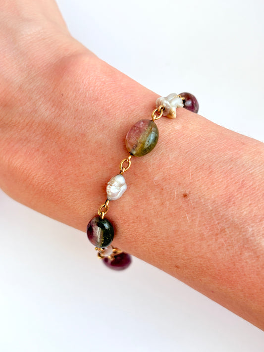 Vintage, 1920s 15ct Gold, Watermelon Tourmaline and Pearl Bracelet, 15g