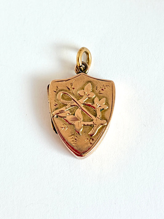 Rare, Victorian, 9ct Gold Shield Locket with Ivy and a equestrian decor, 1901