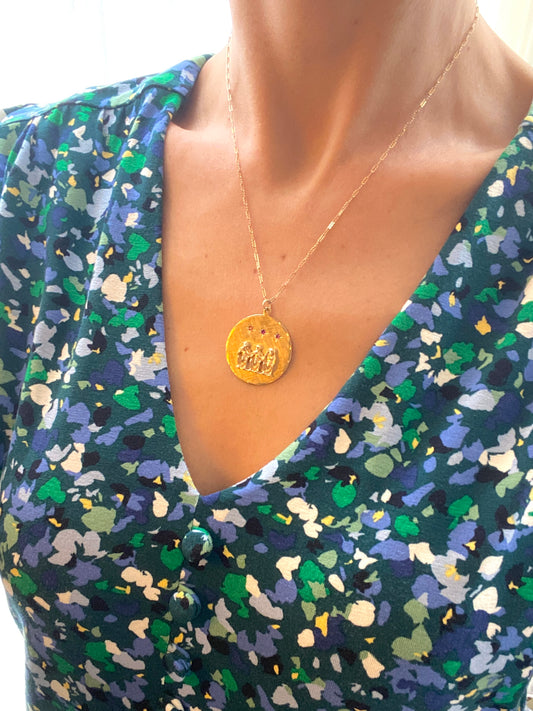 14ct Gold, Vintage 'Three wise monkeys' with Rubies Pendant and Chain, 7.12g