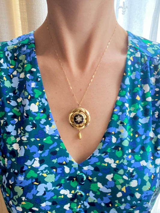 Victorian, Antique, 15ct Gold, Black Enamel and Rose Cut Diamonds Pendant