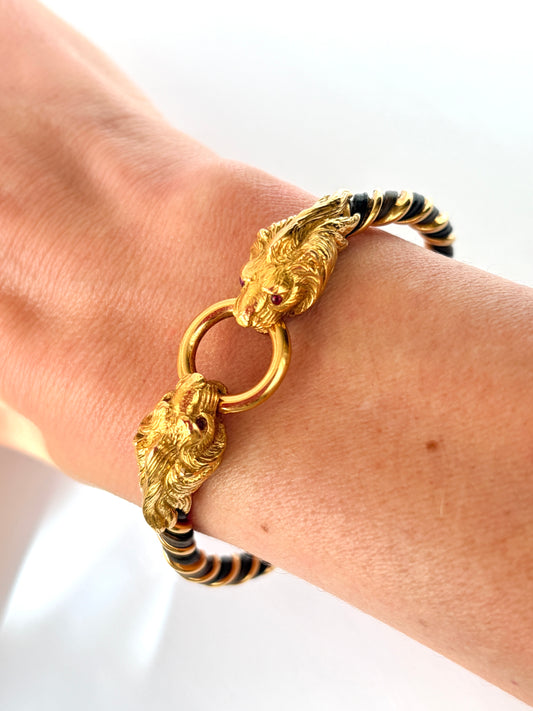 Rare, Victorian, 18ct Gold, Elephant Hair Double Lion Head Bangle, 26.90g