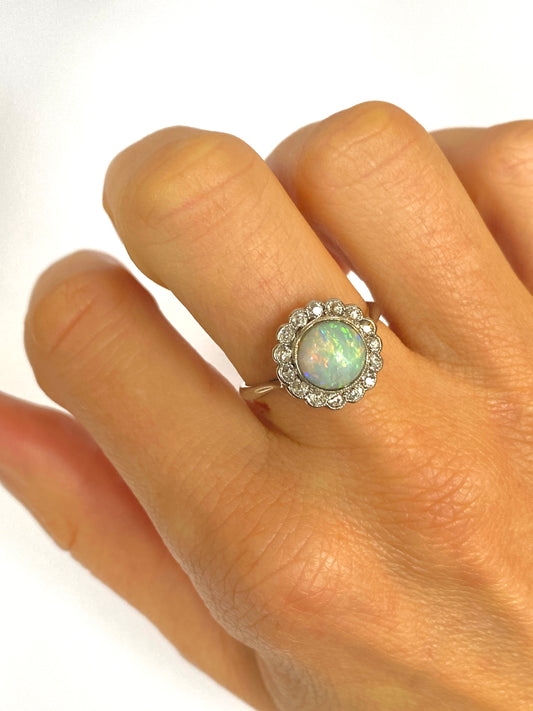 Vintage, Platinum Opal and Old Cut Diamond Cluster Ring, Marked 1928