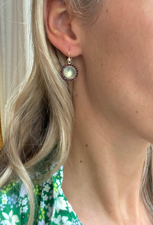 Antique, 9ct Gold Moonstone Garnet cluster drop earrings