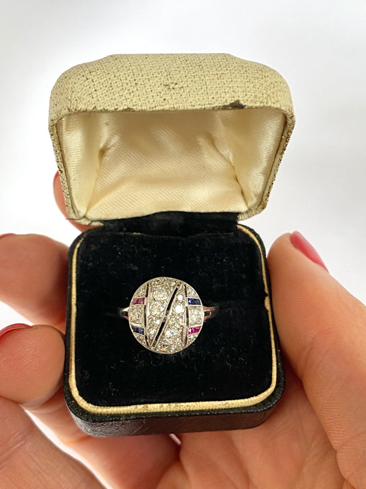 Fabulous Art Deco, Vintage 18ct White Gold Ruby, Sapphire and Diamond Ring