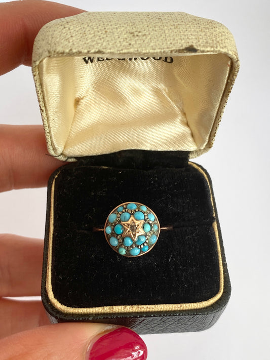 9ct Gold, Antique, Turquoise and Rose Cut Diamond Cluster/Bombe Ring