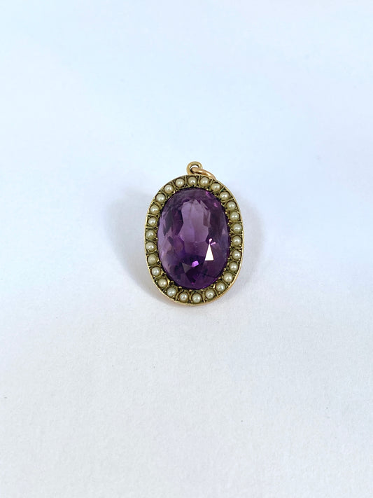 Large, Antique, Victorian 15ct Gold, Amethyst and Seed Pearl Cluster Pendant