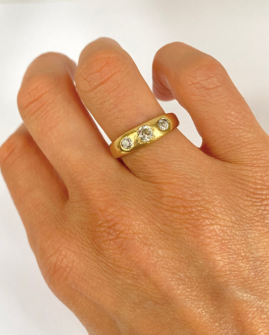 Antique, Old Mine Cut Trilogy Diamond Gypsy Ring, Hallmarked London, 18ct Gold