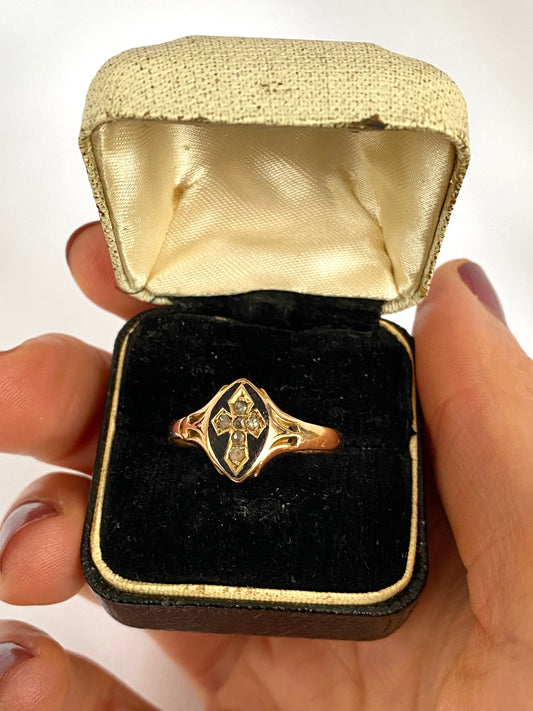 Antique, 18ct Gold Enamel, Rose Cut Diamond Cross Memorial Ring (3.52g)