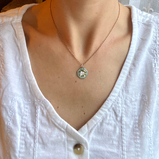 Vintage Silver & Enamel, octagon floral locket with Holly and Hibiscus