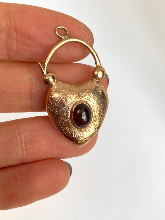 Rare, Antique, 9ct Rosy Gold and Garnet Puffy Heart Padlock Clasp/Pendant (6.59g)