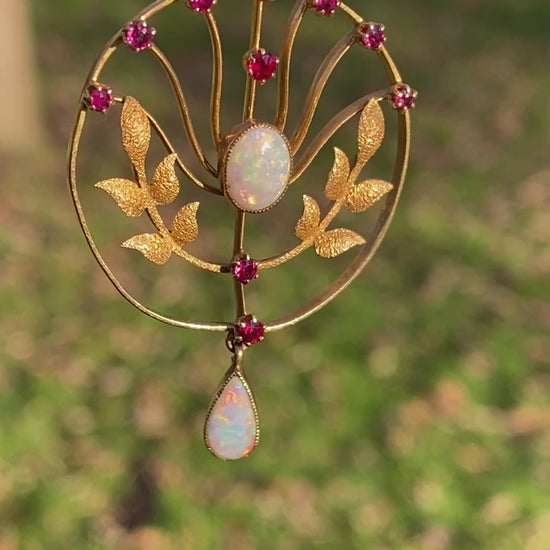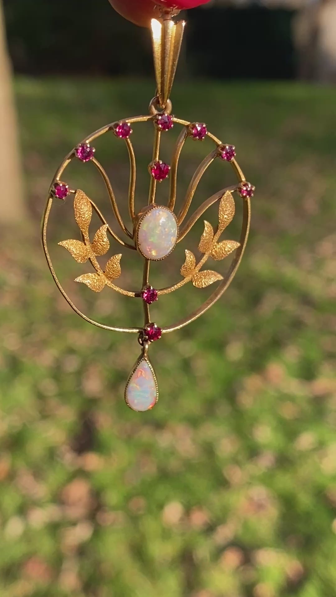 Crafted in 15ct Gold and marked as such on its bale, it features 10 bright rubies spread out around the pendant bordering a central Opal. An additional opal hangs freely from this bottom of the pendant providing little bit of movement and a nice flash of colour as the pendant catches the light.