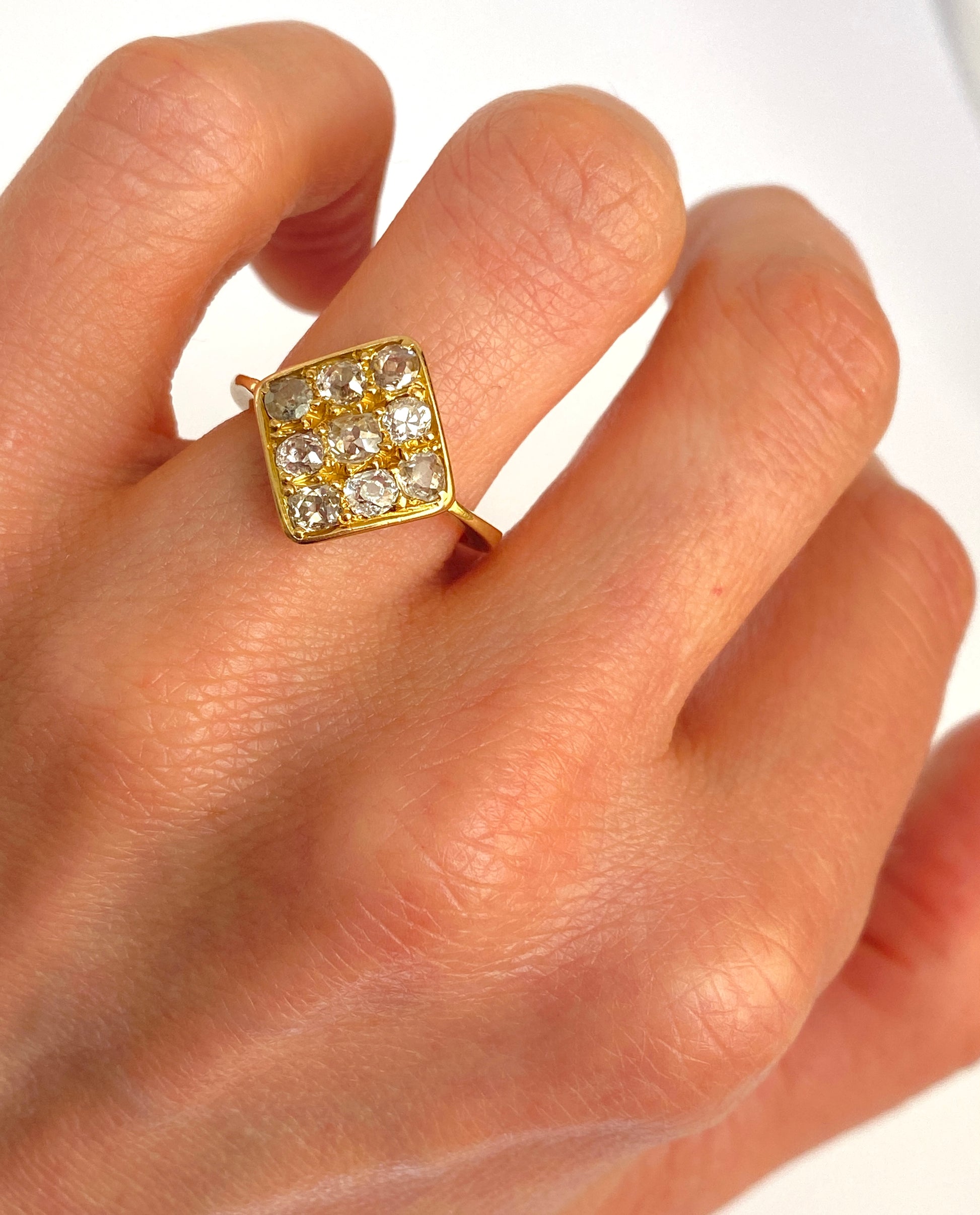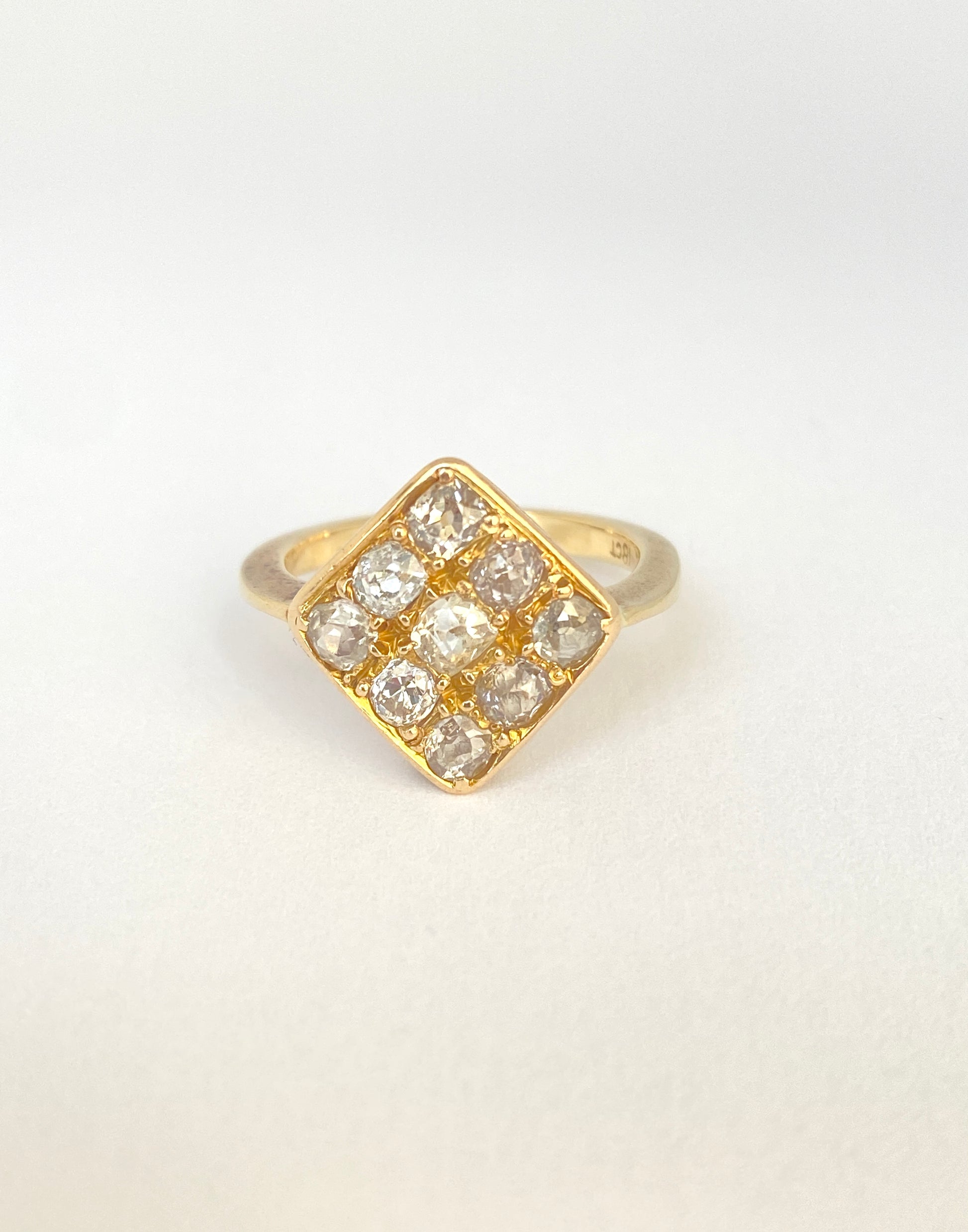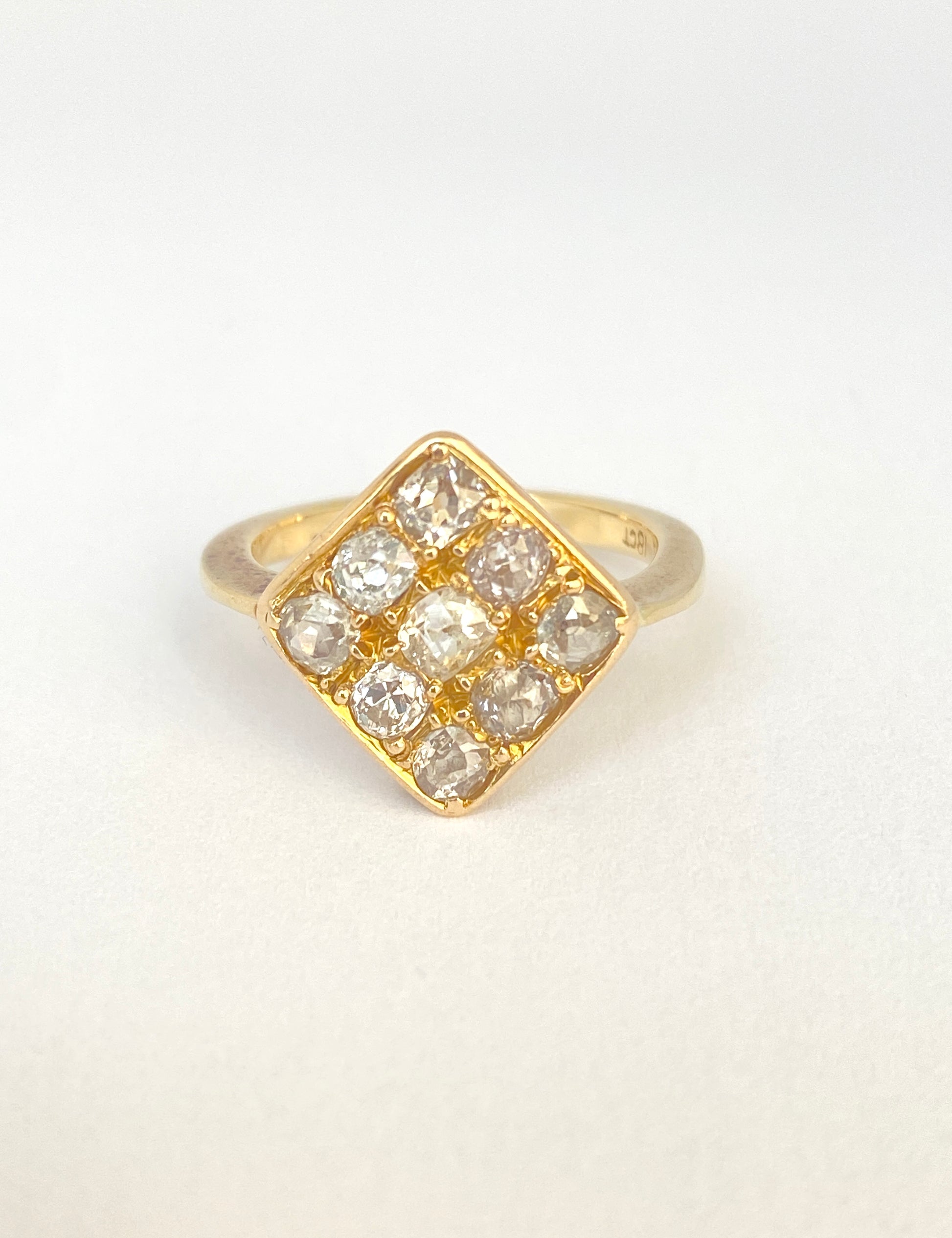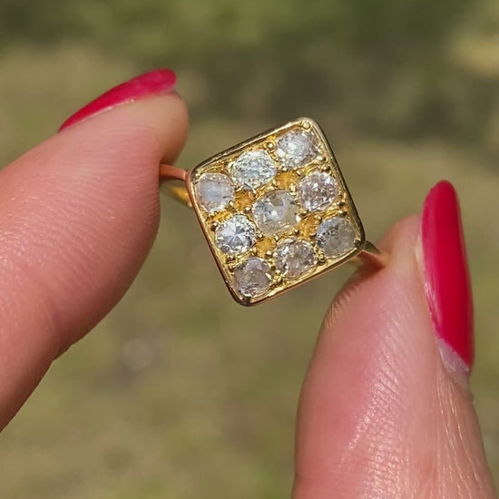 This superb  and one of a kind kite cluster ring features 9 of the most wonderful wonky old mine cut diamonds i have ever come across, totalling an estimated 1.2ct.   The diamonds are set in three rows of three, with the largest at the centre, and arranged in a symmetrical kite shape.