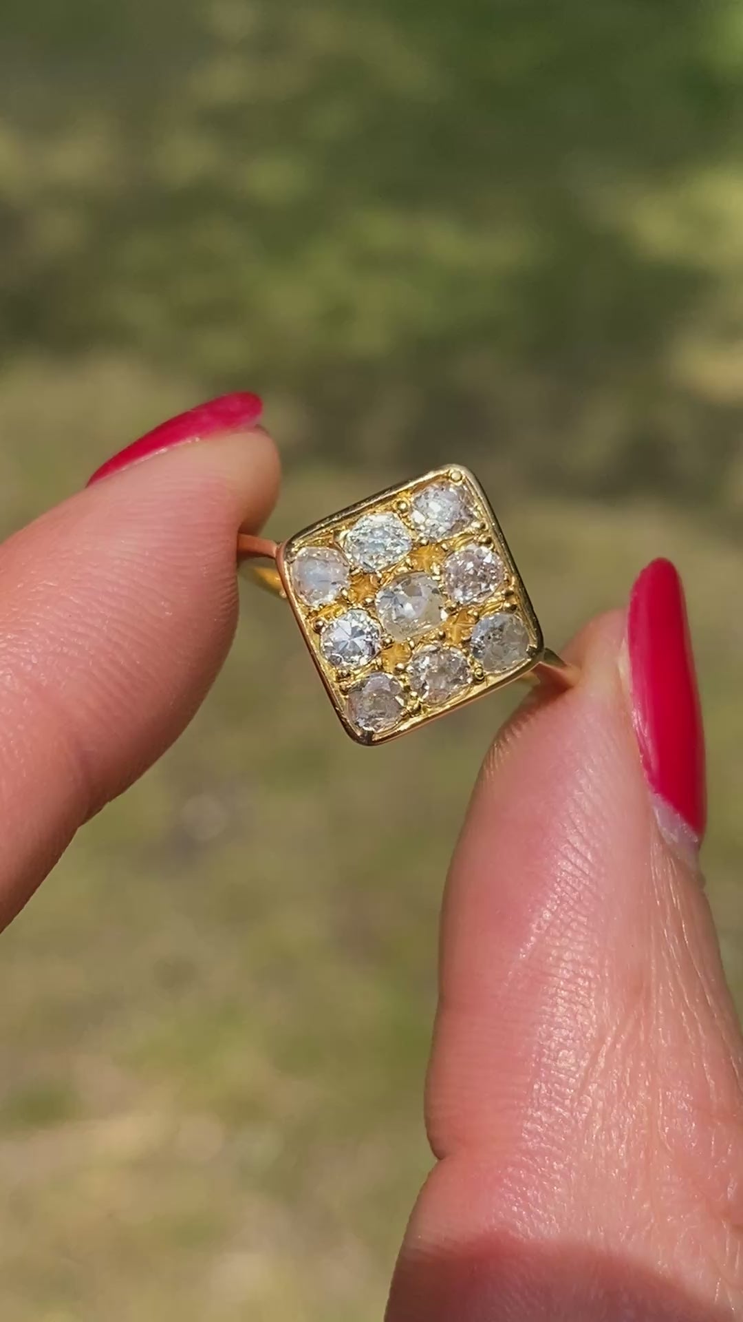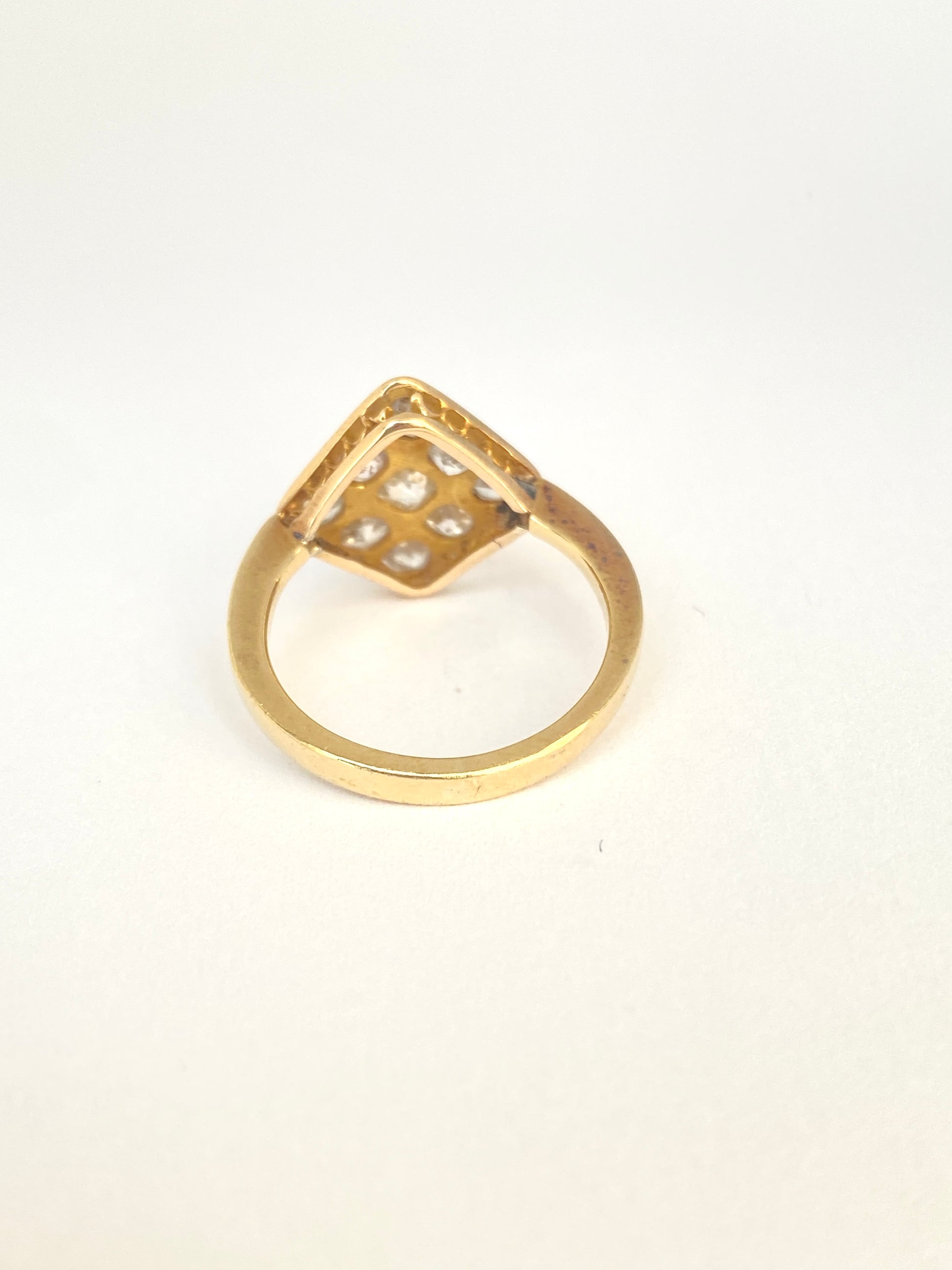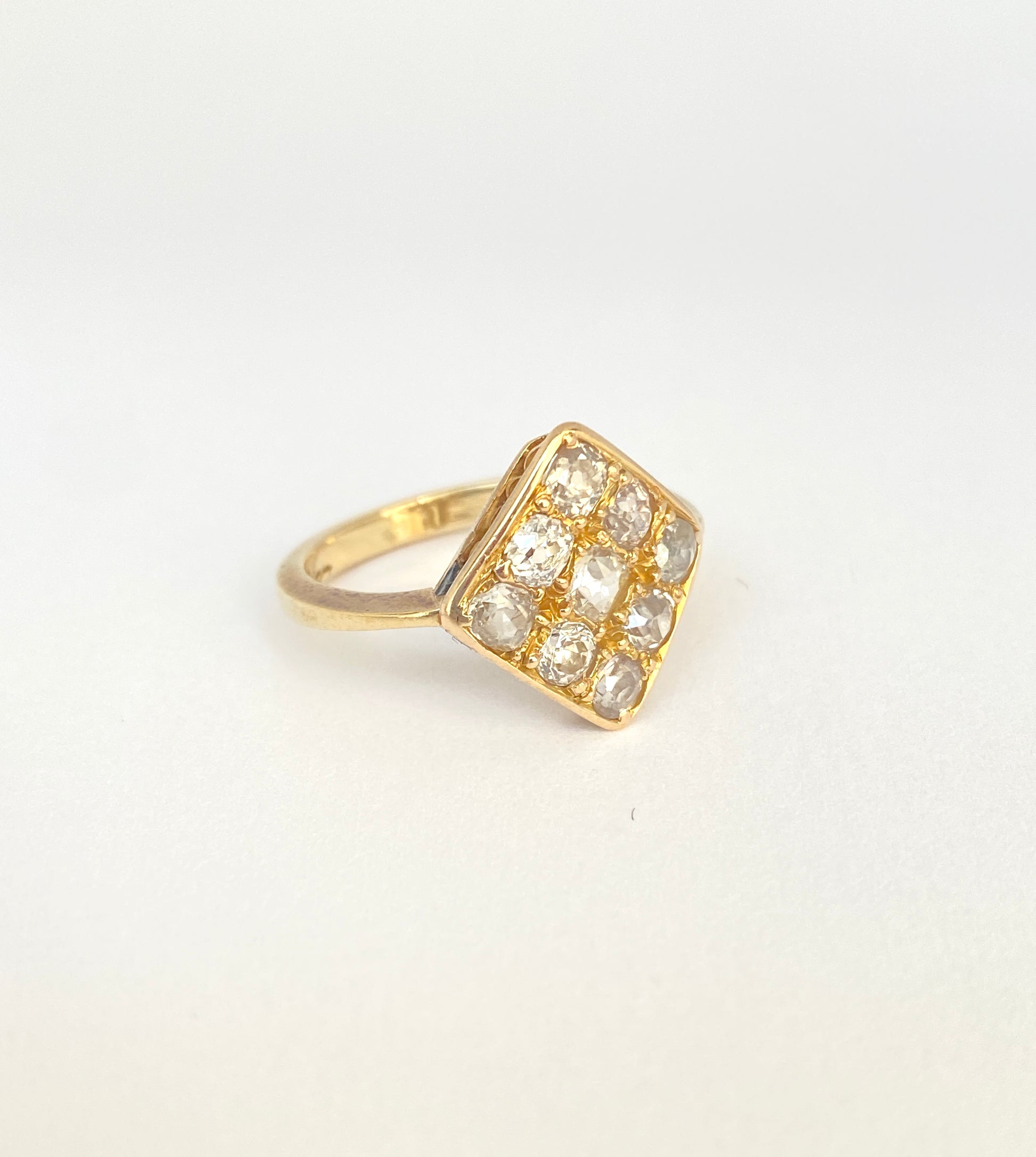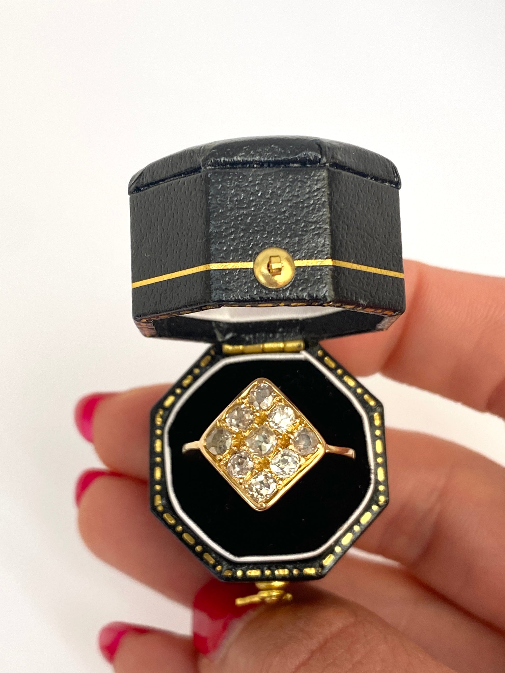 This superb  and one of a kind kite cluster ring features 9 of the most wonderful wonky old mine cut diamonds i have ever come across, totalling an estimated 1.2ct.   The diamonds are set in three rows of three, with the largest at the centre, and arranged in a symmetrical kite shape.