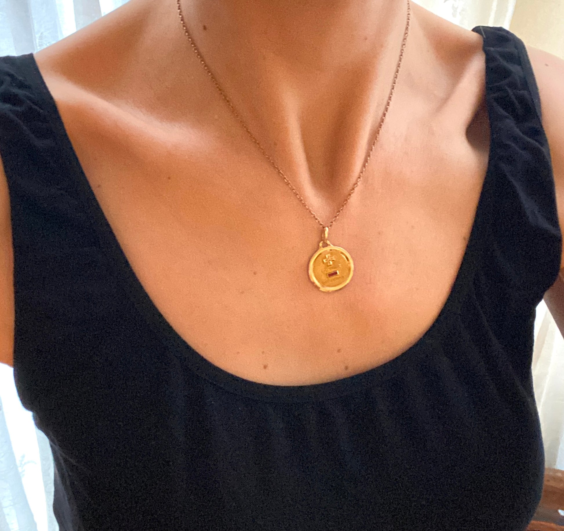This romantic and difficult to find pendant/charm also features a diamond in the plus sign, and two rubies in the minus sign. It measures 12.2cm and it weighs 3.7g of solid 18ct gold. It dates to around 1910 and is hallmarked/ signed by A.A on its front