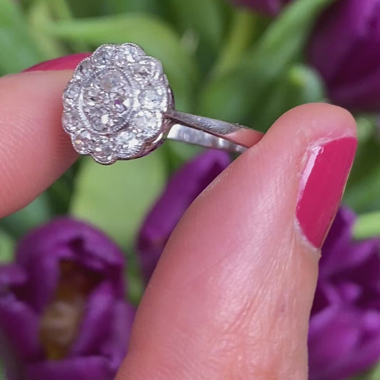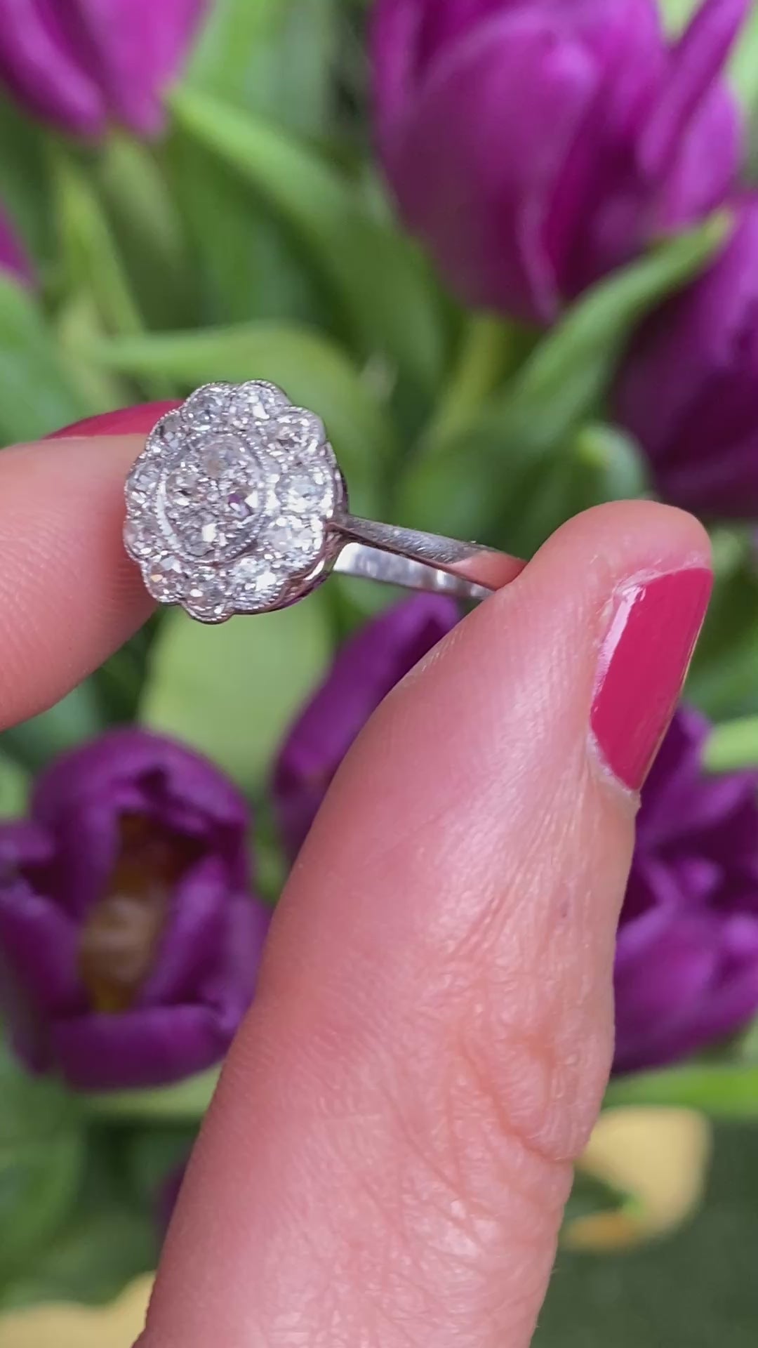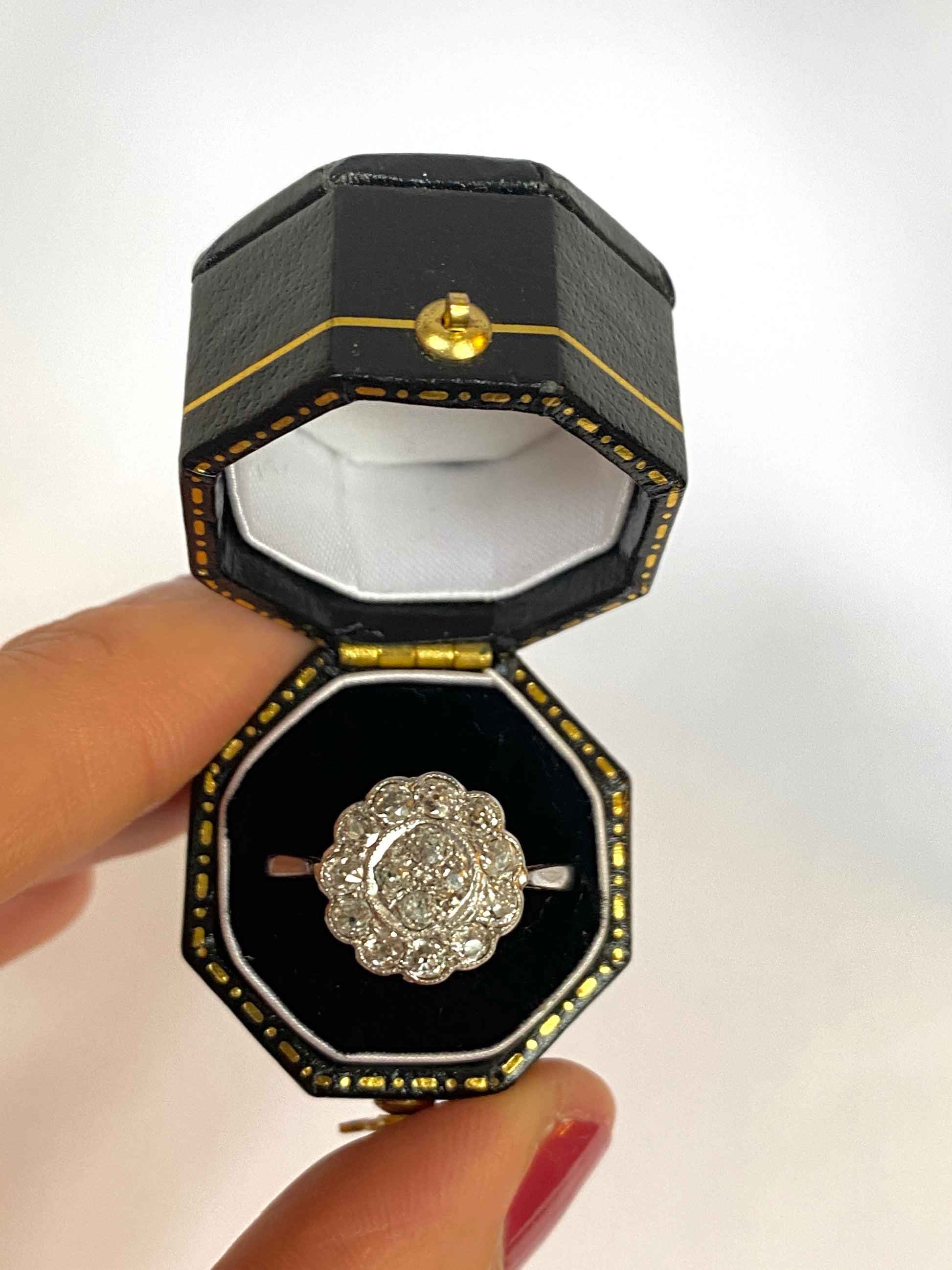 This is an absolutely fabulous Art Deco, diamond extravaganza of a cluster ring! Set on a white 18ct Gold gallery, it features a total of 15 diamonds; a central cluster of 4 old cut diamonds, and then a border of 11 further old cut diamonds, all arranged in a pretty flower motif.