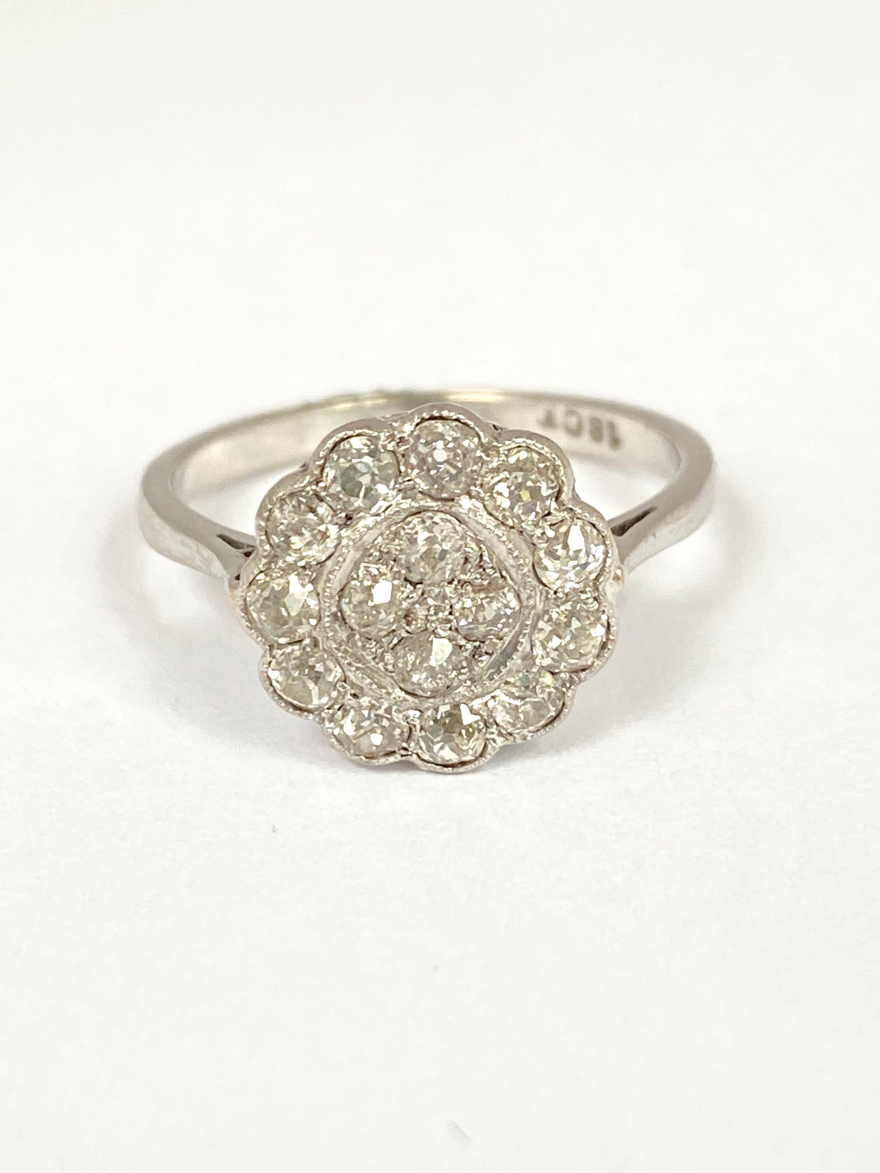 18ct White Gold, Art Deco, Old Cut Diamond Cluster / Engagement Ring, Circa 1940