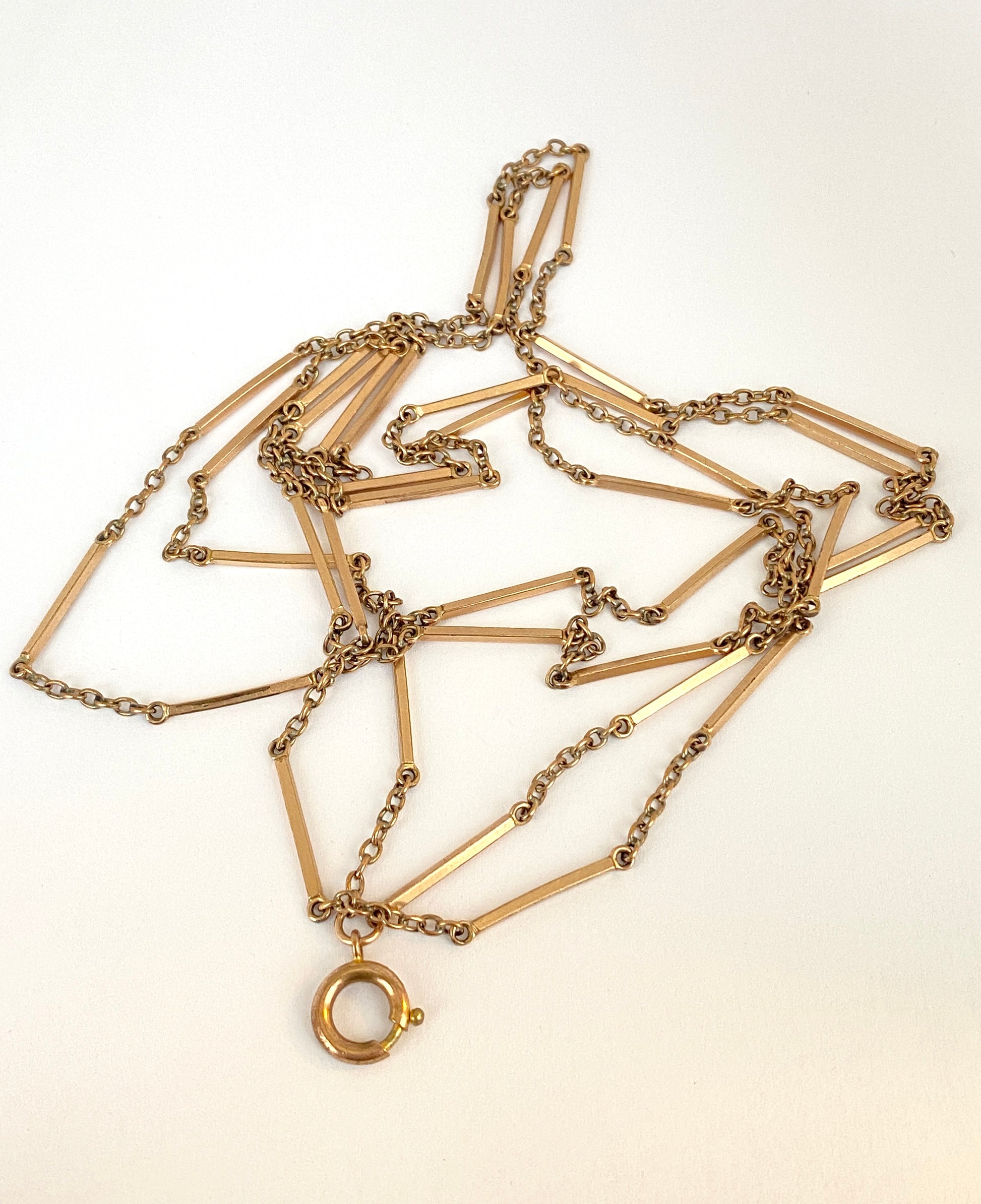 This beautiful antique long guard chain dates to the late 19th Century. Crafted from 9ct-gold fill, it features rectangle links separated by cable chain and a bolt ring at its end from which charms or pendants can be added