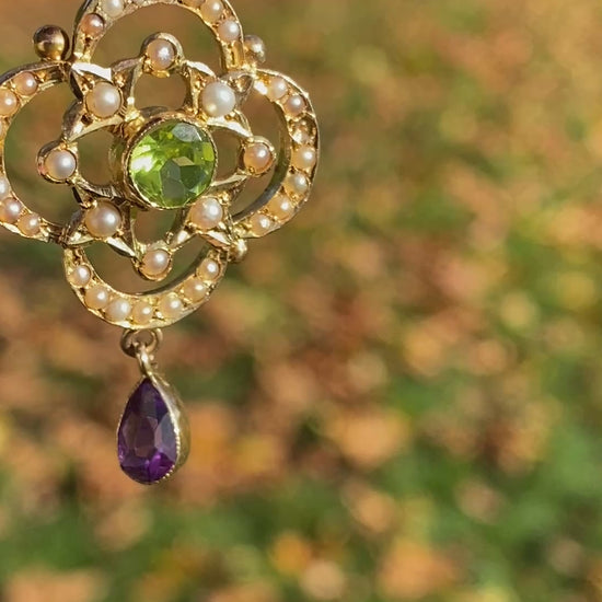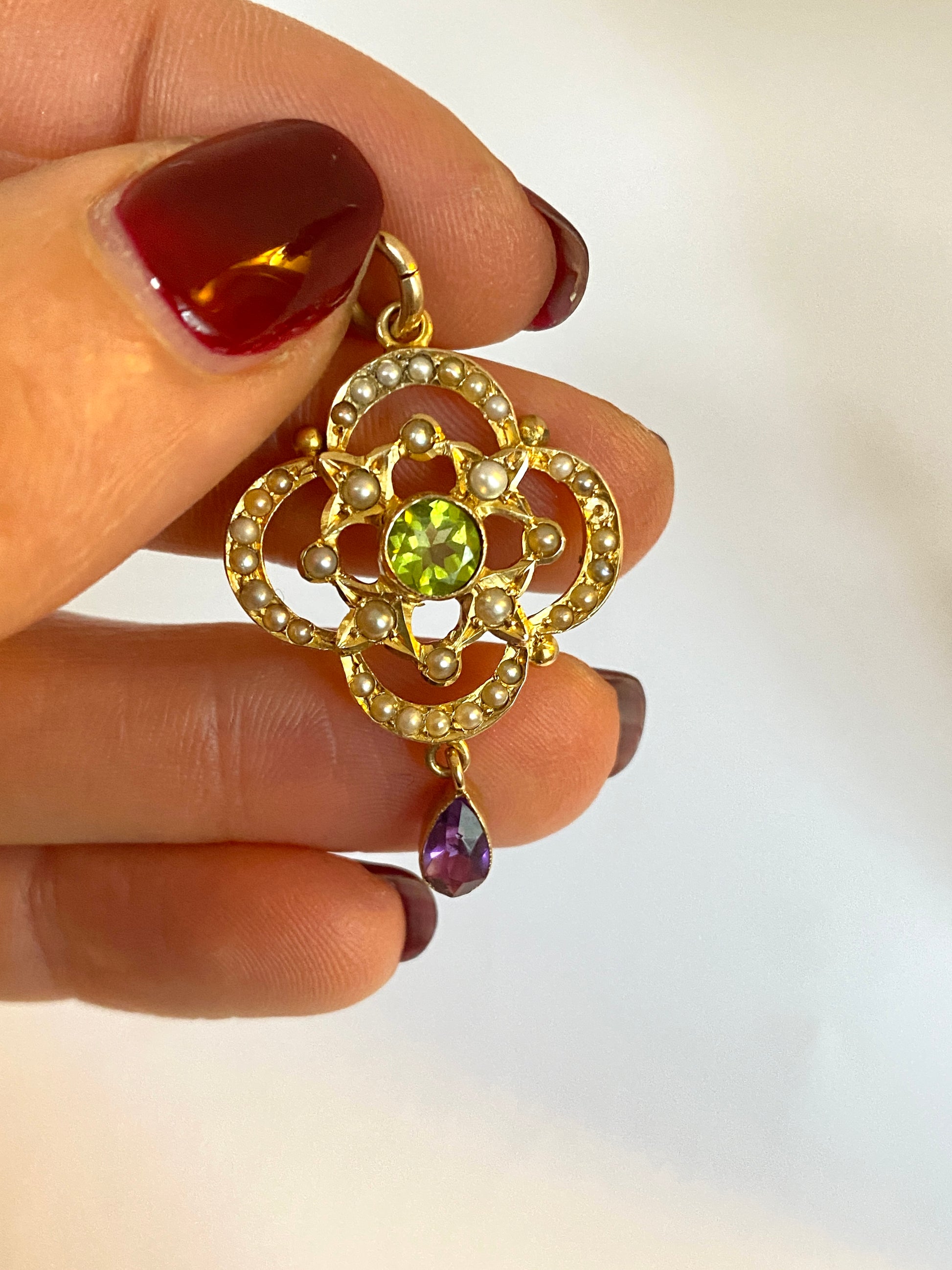 Set in a strong 9ct gold, this superb antique pendant features a central bezel set peridot surrounded by a display of beautifully scattered pearls in a quatrefoil shape. A single amethyst gemstone hangs in its own bezel setting from the base of the pendant, giving the piece additional length and some movement.
