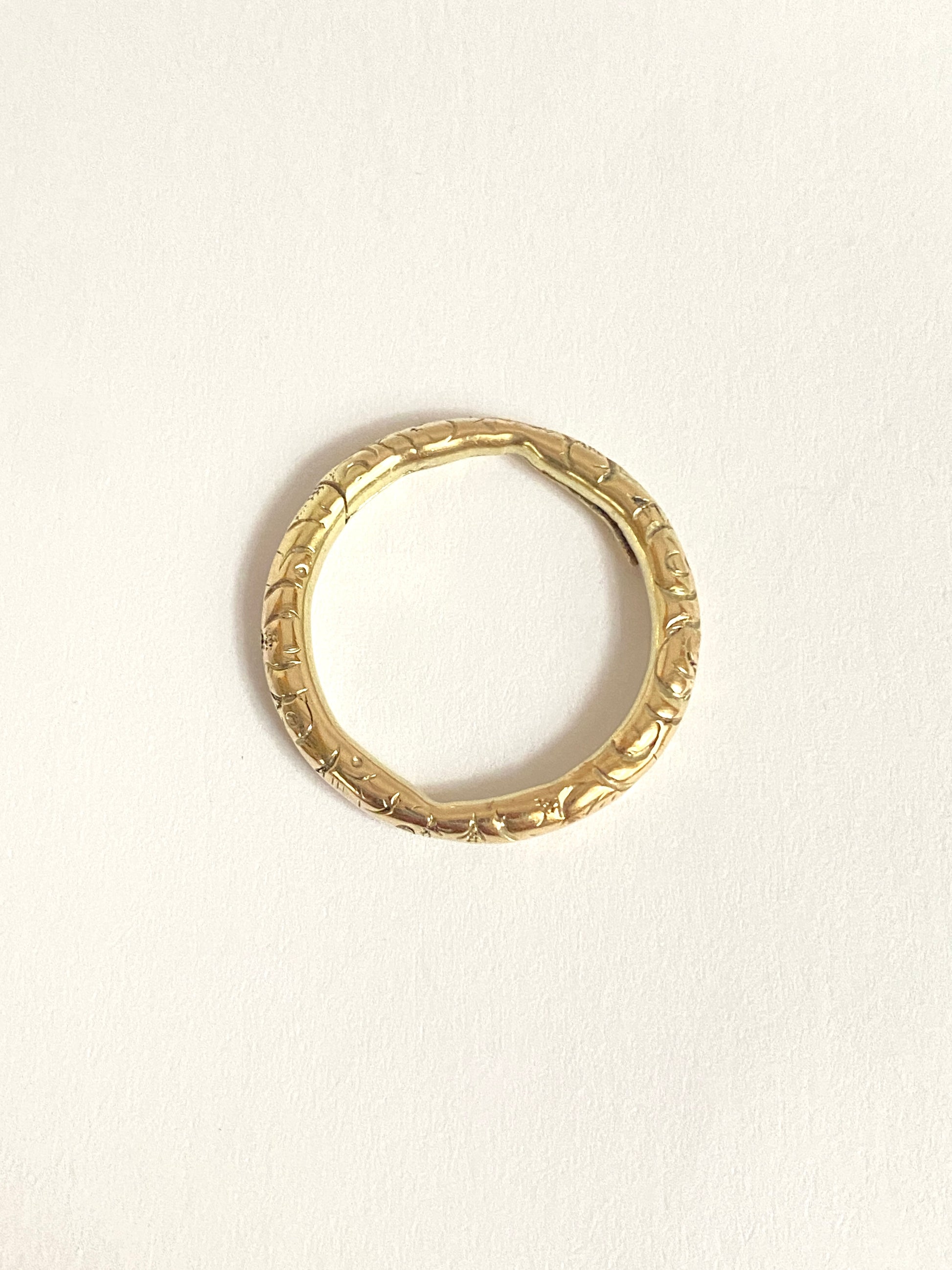 This stunning split ring, in full working order, is crafted from solid 15ct gold and remains in fabulous condition. It is highly decorated on both sides with wonderfully ornate engraving.