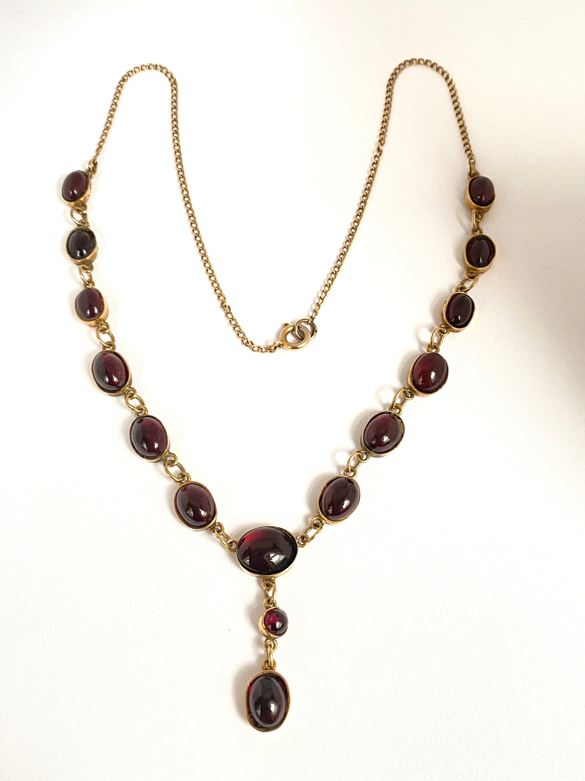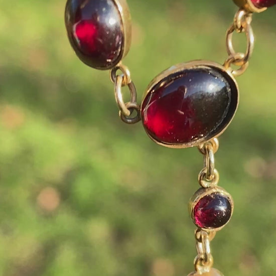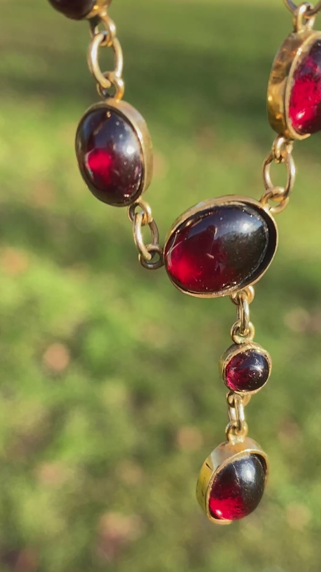This magnificent antique garnet necklace is crafted from 9ct Gold and features 15 blood-red bezel set (closed back) garnets. The graduated gems are all well set and in wonderful condition. Two additional gems hang from the largest garnet at the base of the necklace, providing some additional length, and allowing the pendant some movement.