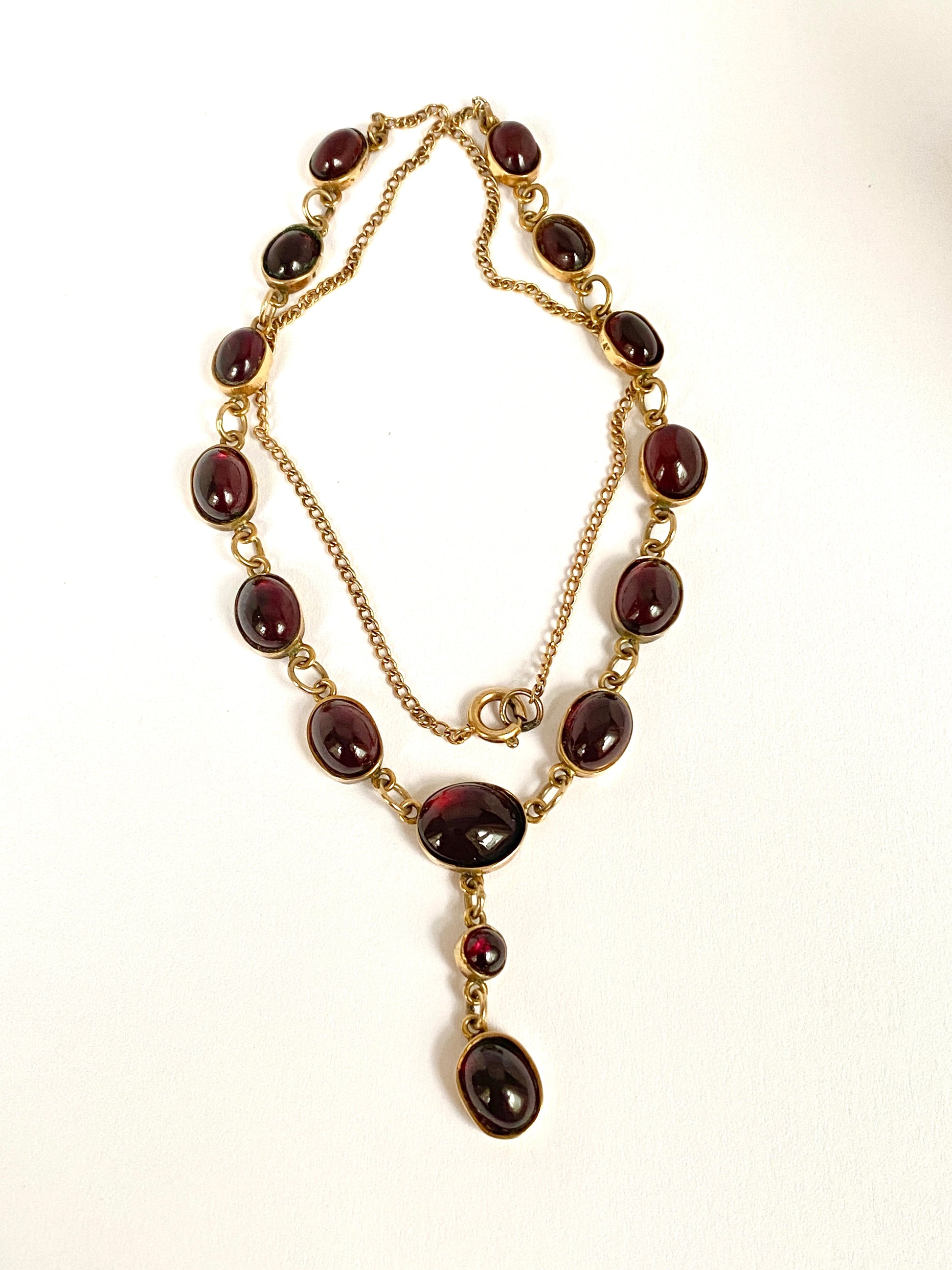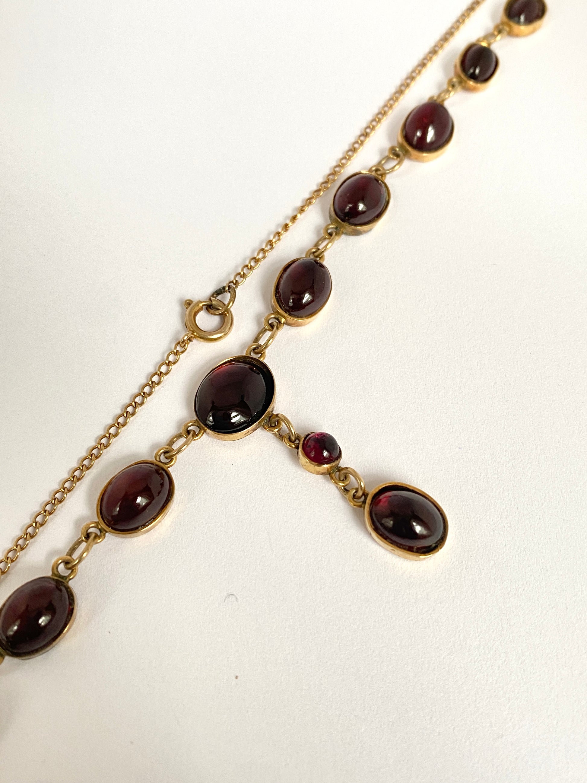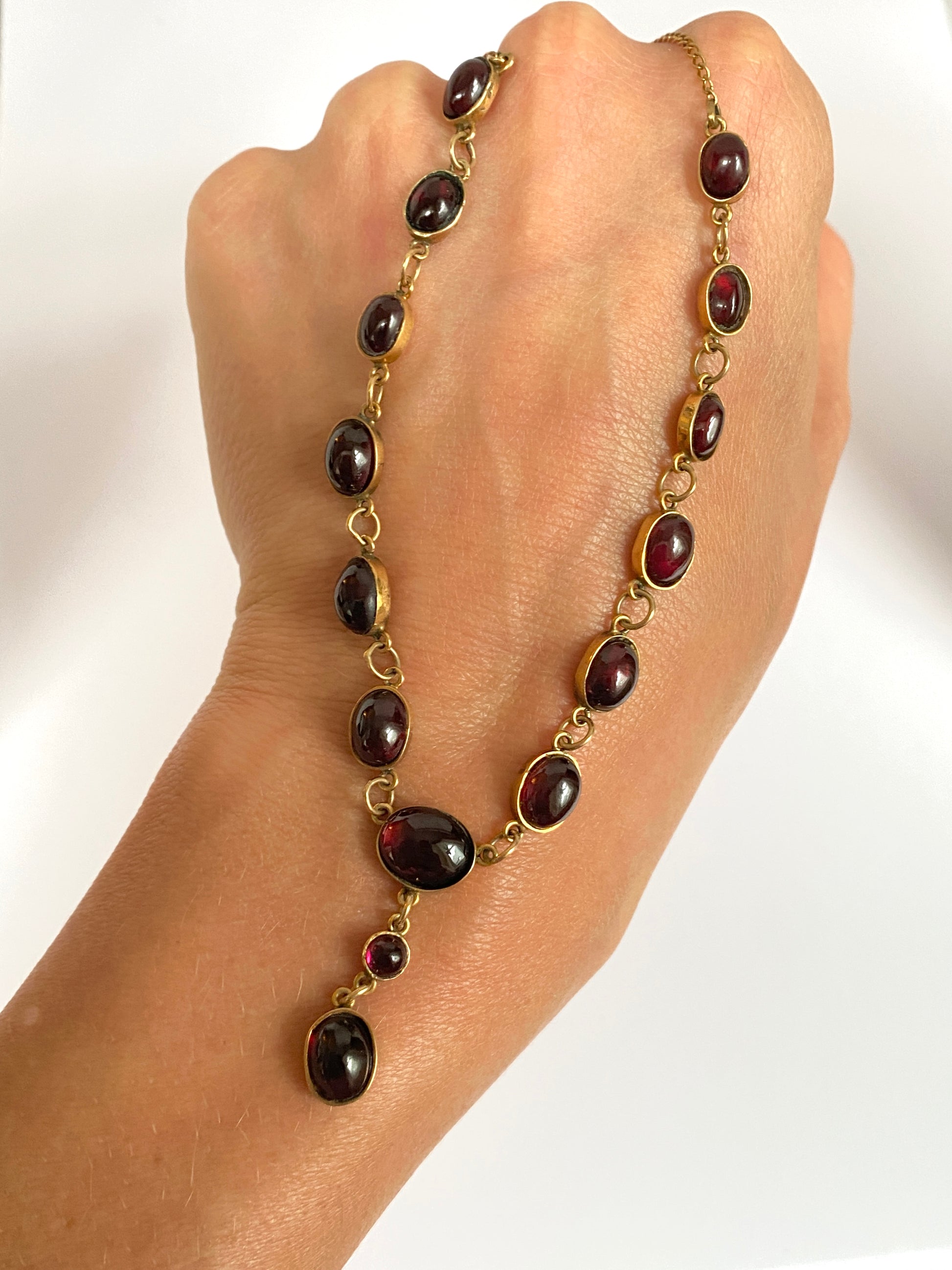 This magnificent antique garnet necklace is crafted from 9ct Gold and features 15 blood-red bezel set (closed back) garnets. The graduated gems are all well set and in wonderful condition. Two additional gems hang from the largest garnet at the base of the necklace, providing some additional length, and allowing the pendant some movement.