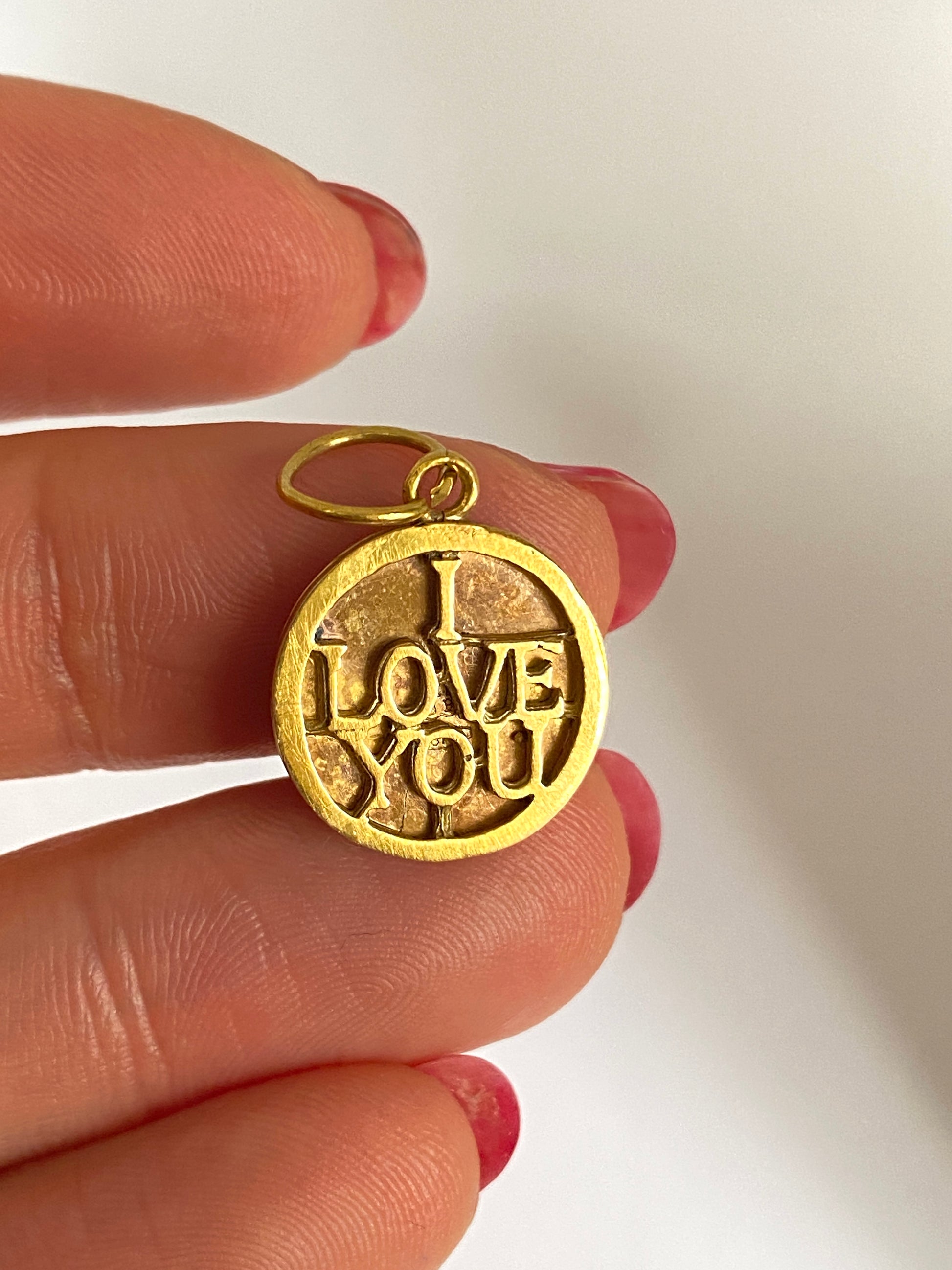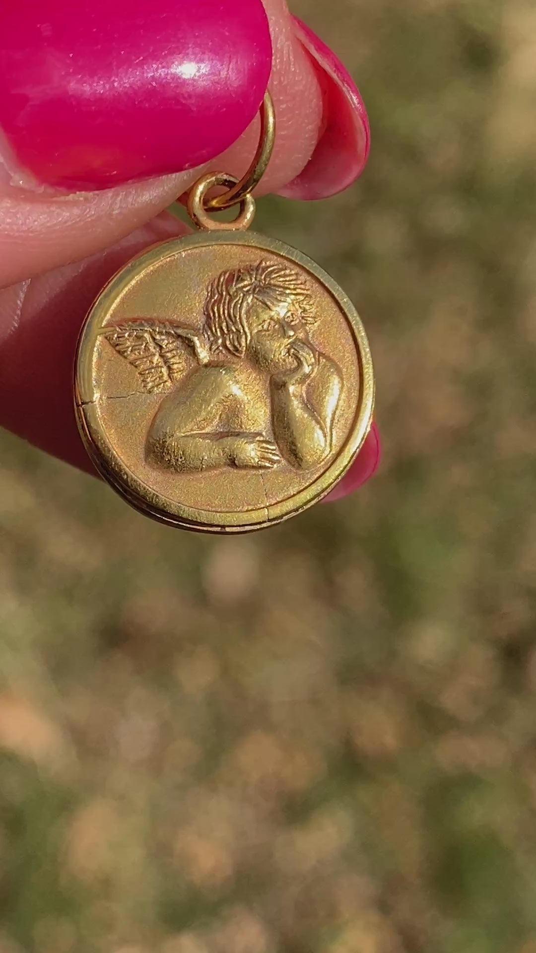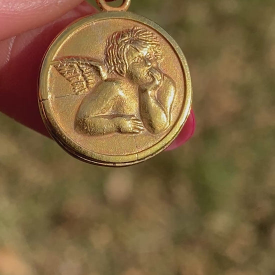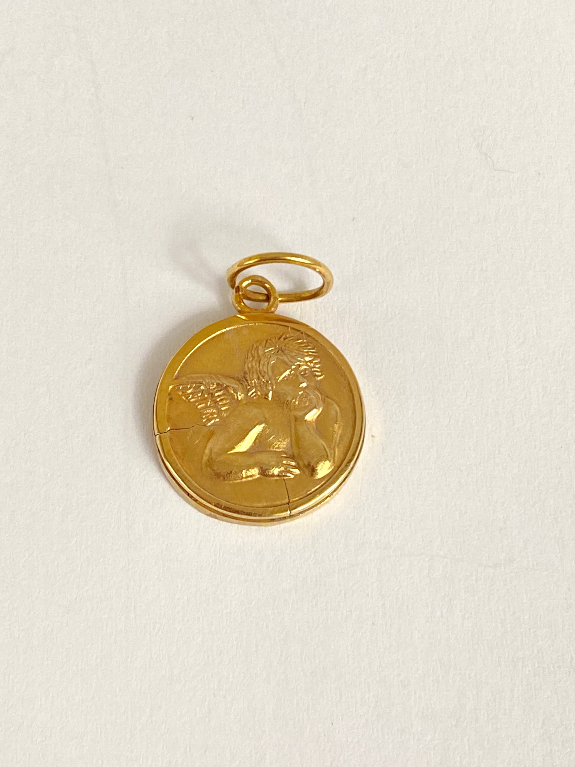 This is a wonderful vintage, double sided angel medal/pendant. Crafted from 9ct Gold, it features Raphael’s cherub on its front and the message, 'I love you' on its reverse.