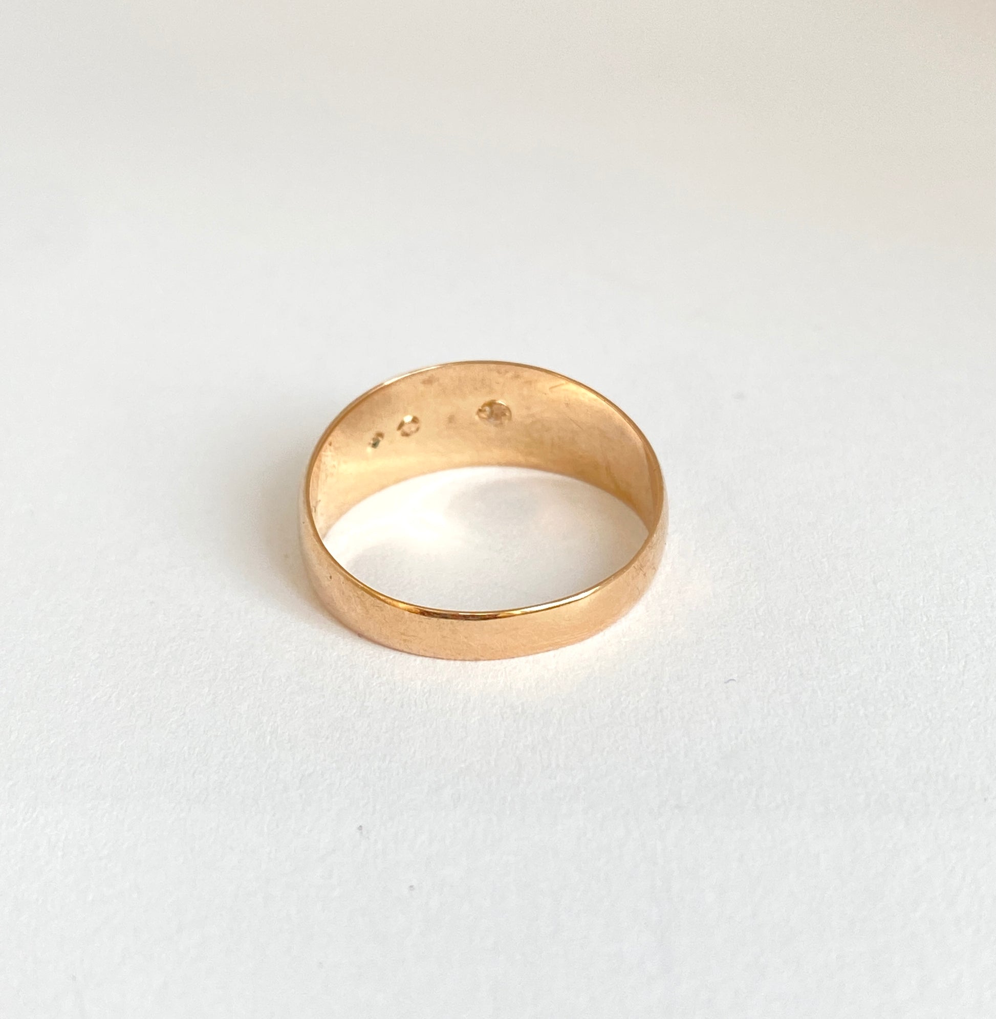 Set in a warm, slightly rosy 15ct gold, these bright gems are claw set and in excellent condition. The band is currently a UK size N 1/2 (US size 7) but it could be re-sized. It weighs 2.82g. The 15ct gold band is hallmarked for 15ct Gold, Chester and the year 1897.