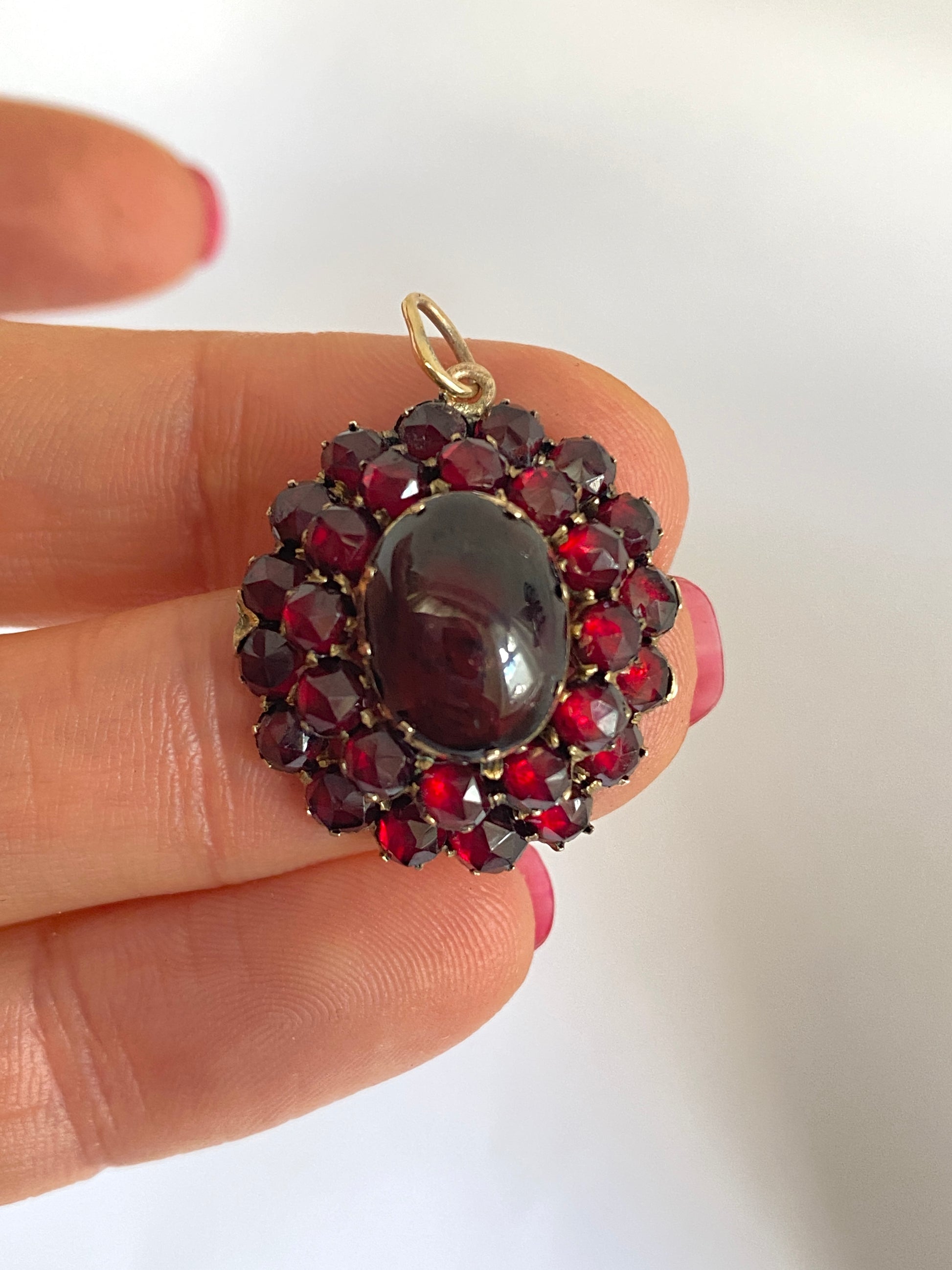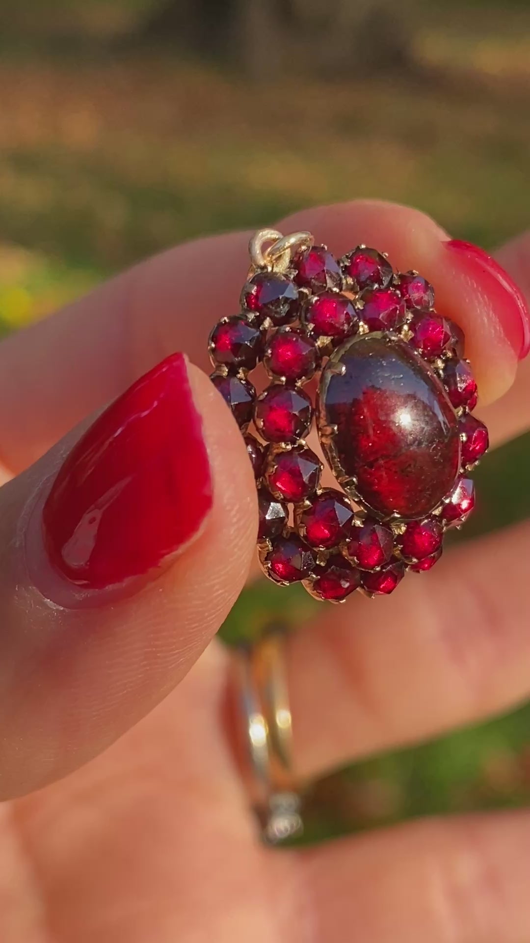 This stunningly beautiful and unique cluster pendant is crafted in 9ct Gold. It features a wonderful natural garnet cabachon at its centre, which is bordered by two rows of twinkling blood red garnets, a row of 16 and a row of 12. These garnets lightly up beatifully under the light - please see the video!