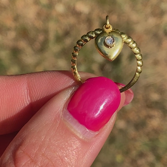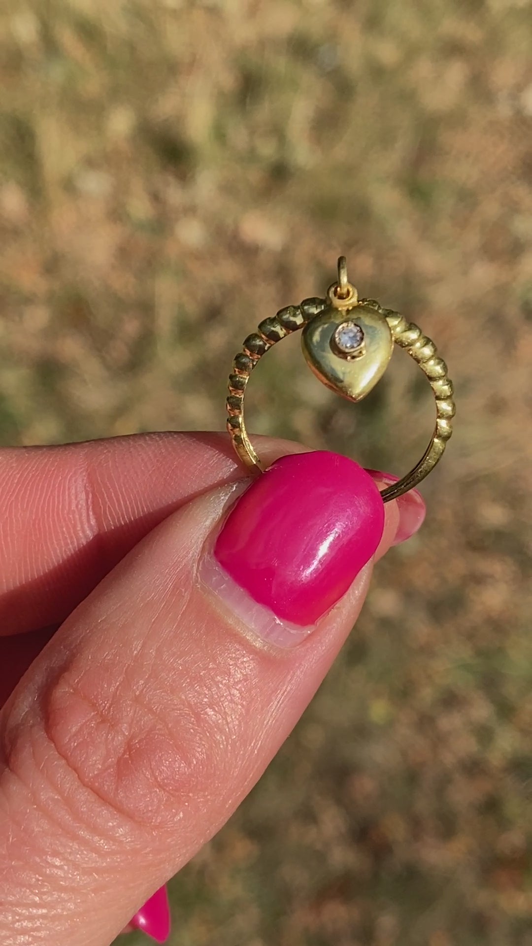 This is such a pretty Vintage Diamond Heart Ring. The 18ct gold band has wonderful knobbly texture on its front half, and at its top hangs a puffy heart charm with a central diamond.