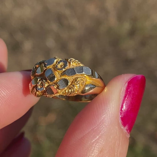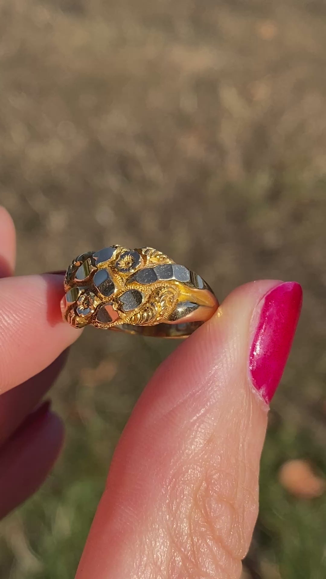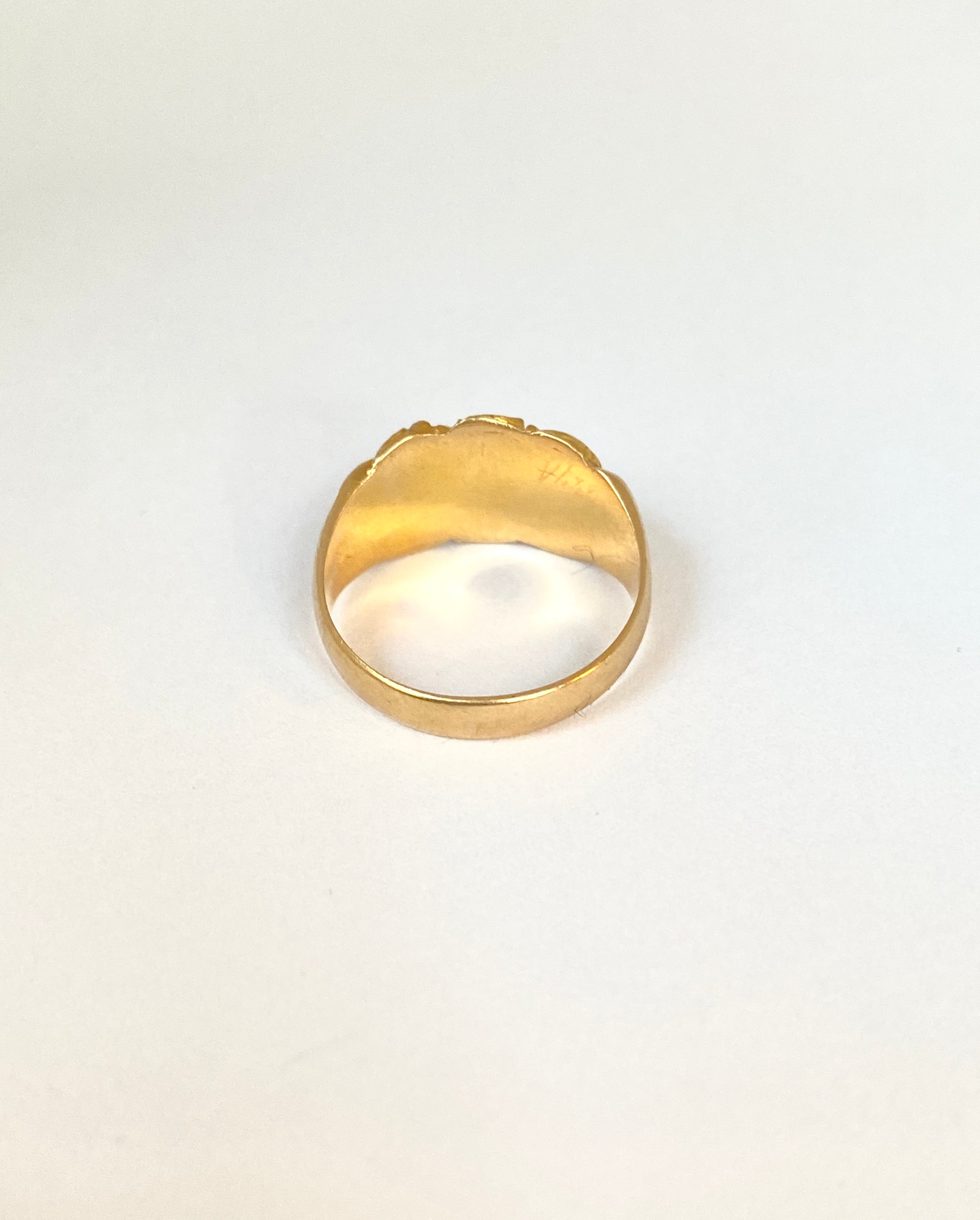 This is such a fabulous and unusual antique ring. Crafted in a bright and buttery 18ct gold and engraved with a unique design, this Edwardian ring is fully and clearly hallmarked for 18ct Gold, Birmingham and the year, 1912.