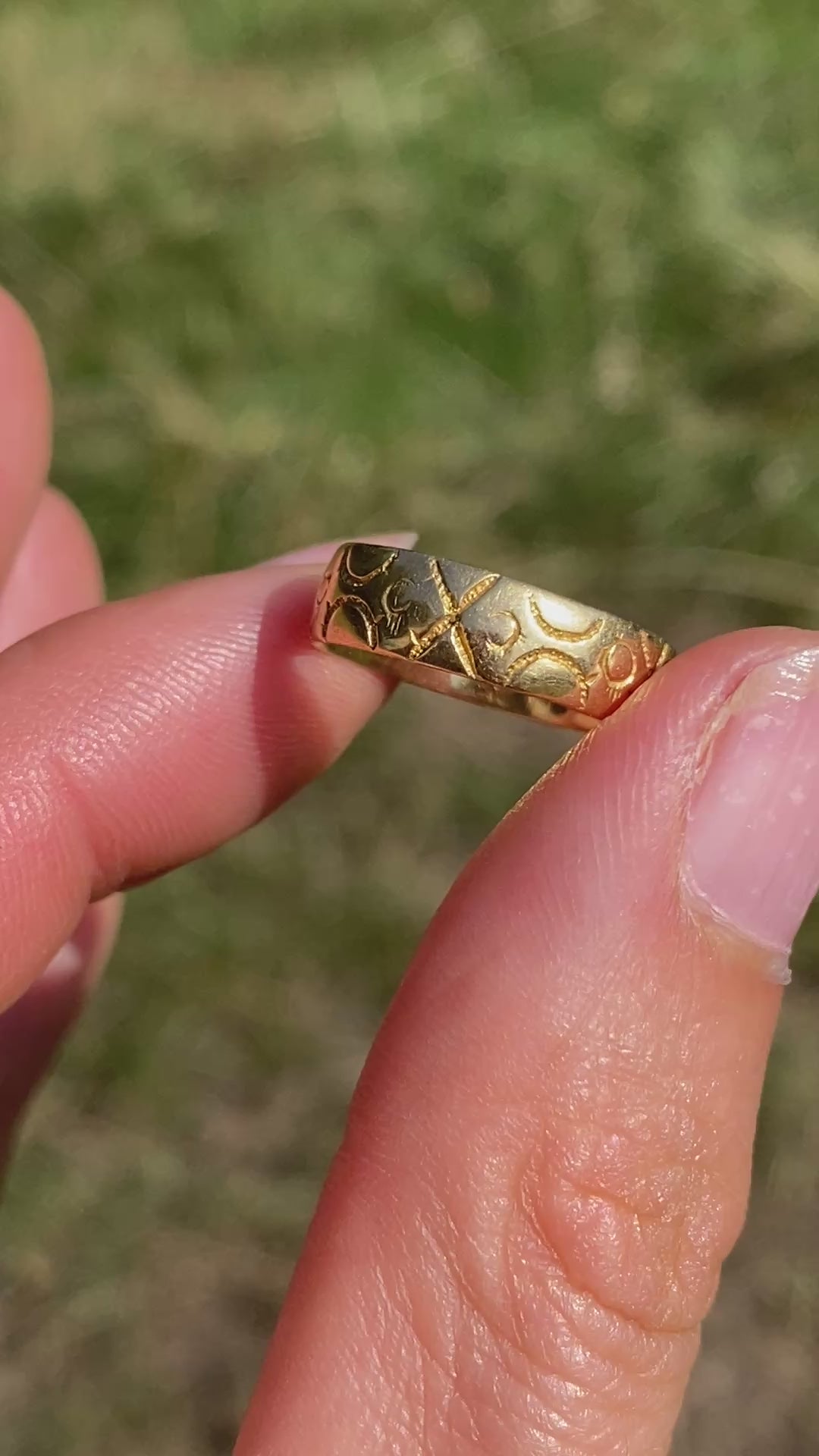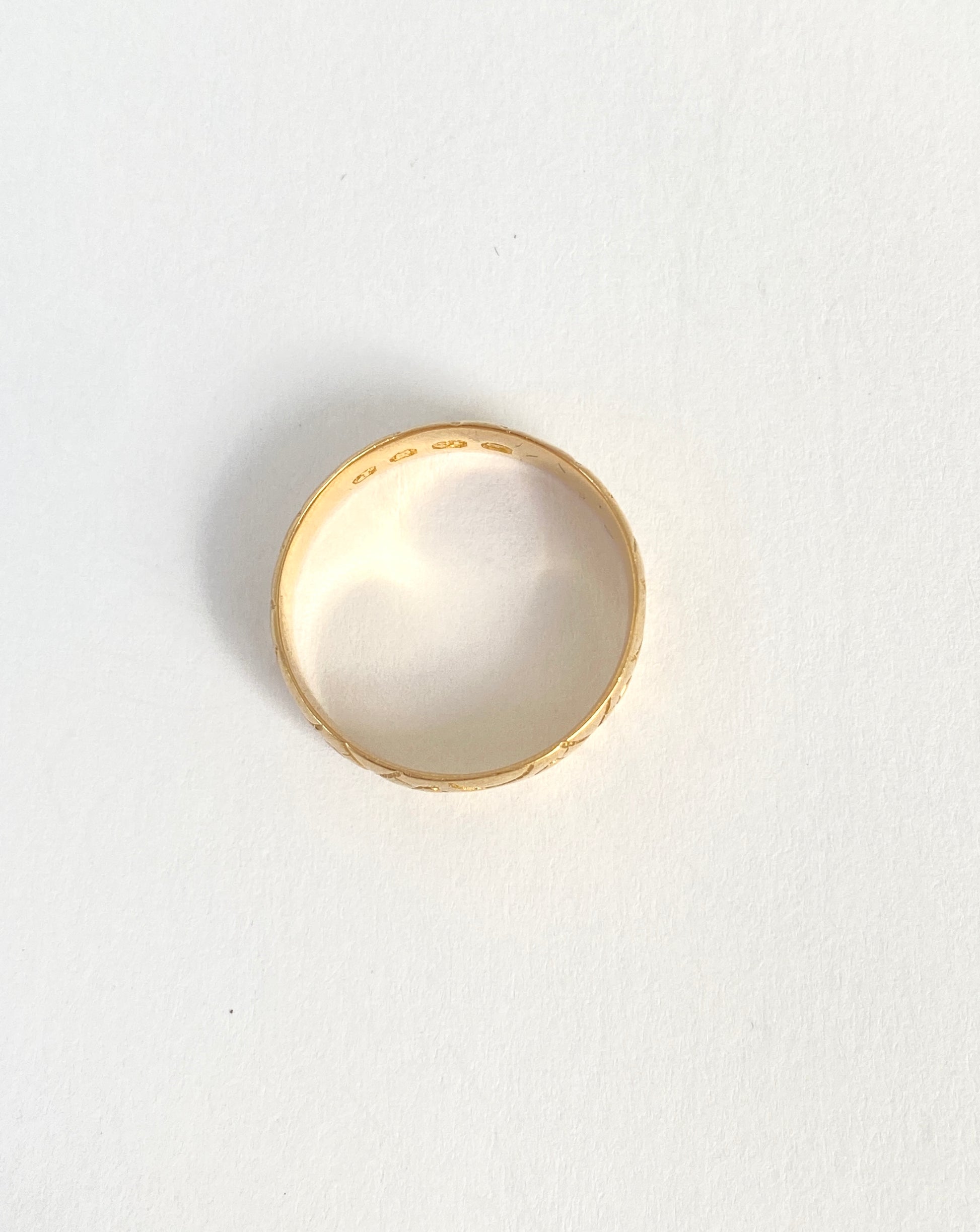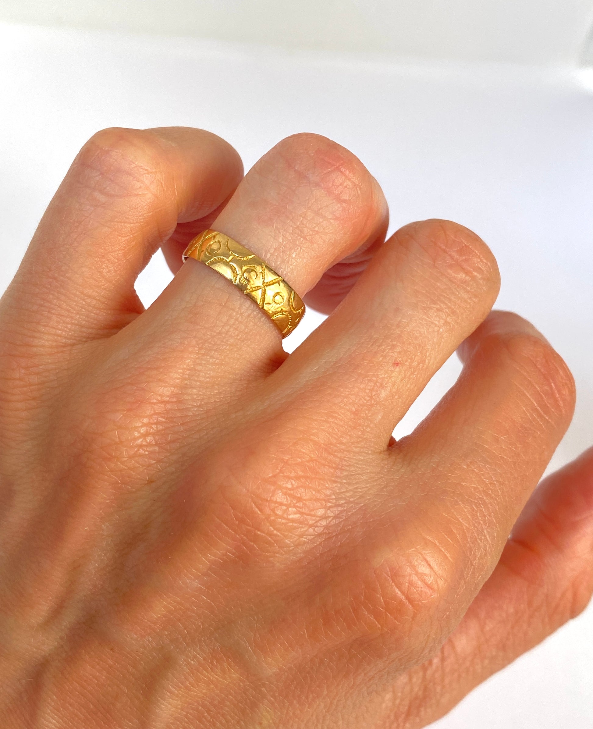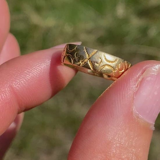 Crafted from a bright and buttery 18ct Gold, this stunning Victorian wedding band was a wonderful find. It features beautiful and intricate engravings of croses and circles which cover the entirity of the ring so that it can be worn in any position.