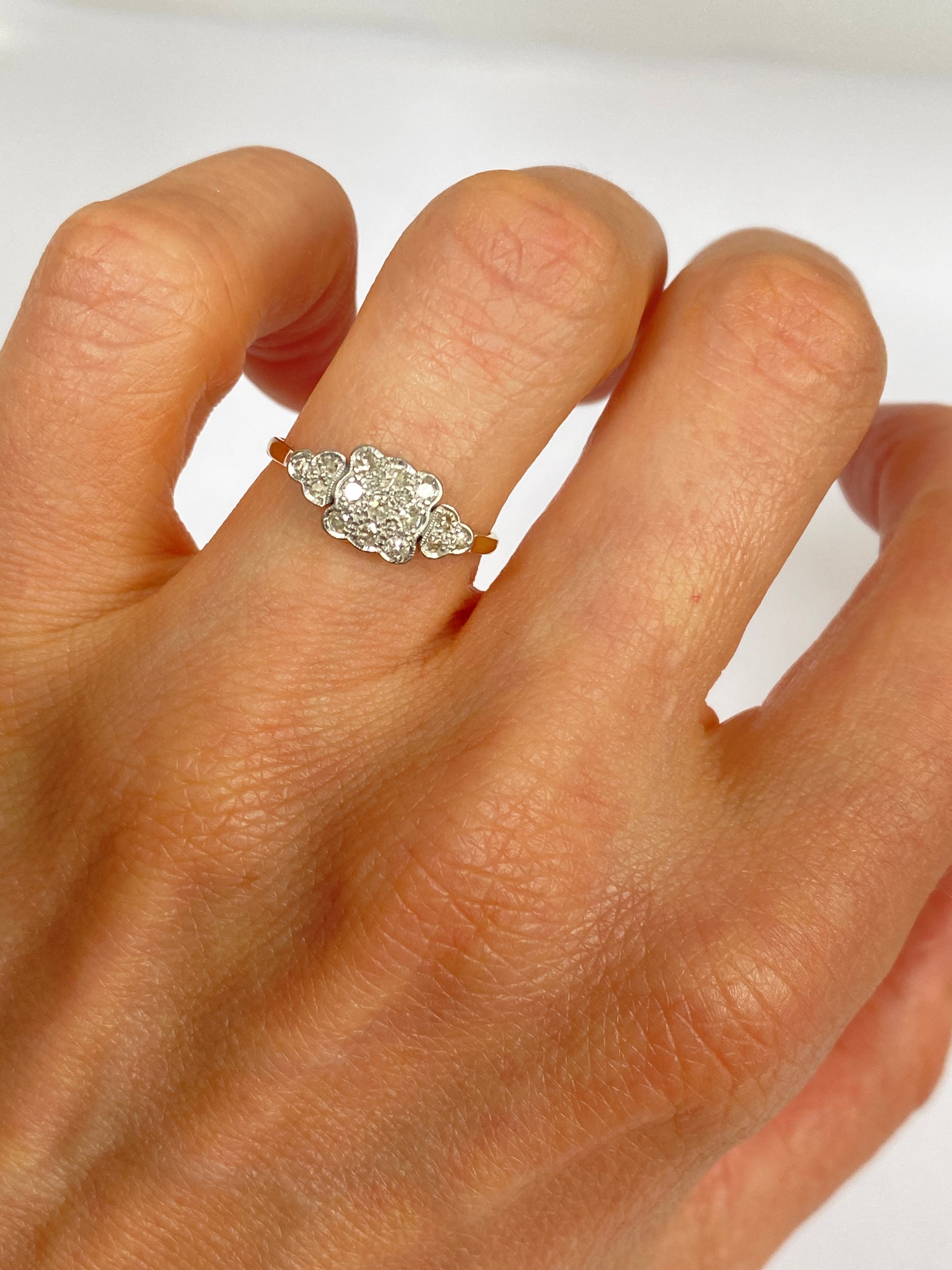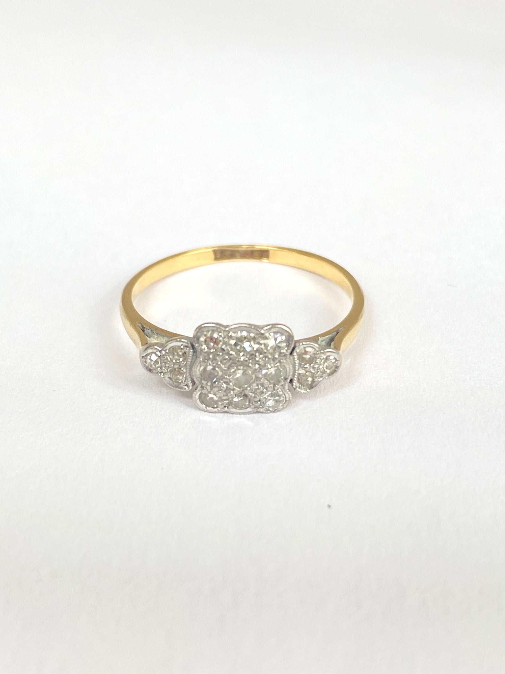This is a really striking antique diamond cluster ring. Crafted in 18ct gold and platinum, this classical art deco ring features a central scalloped square, filled with 9 old cut diamonds, with three further diamonds on each shoulder, providing maxinum finger coverage, all a platinum gallery.