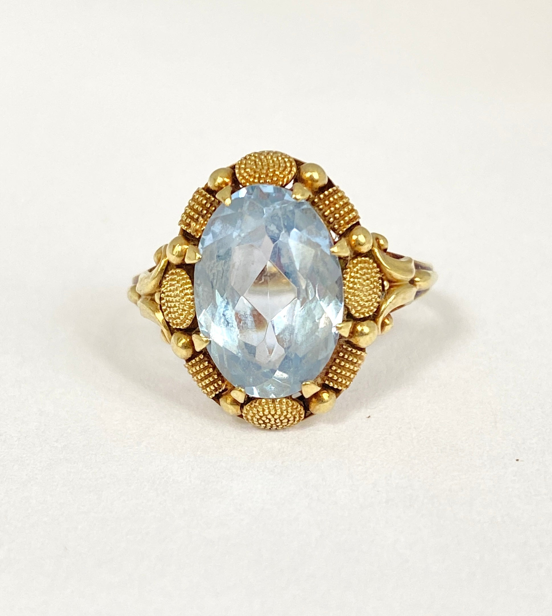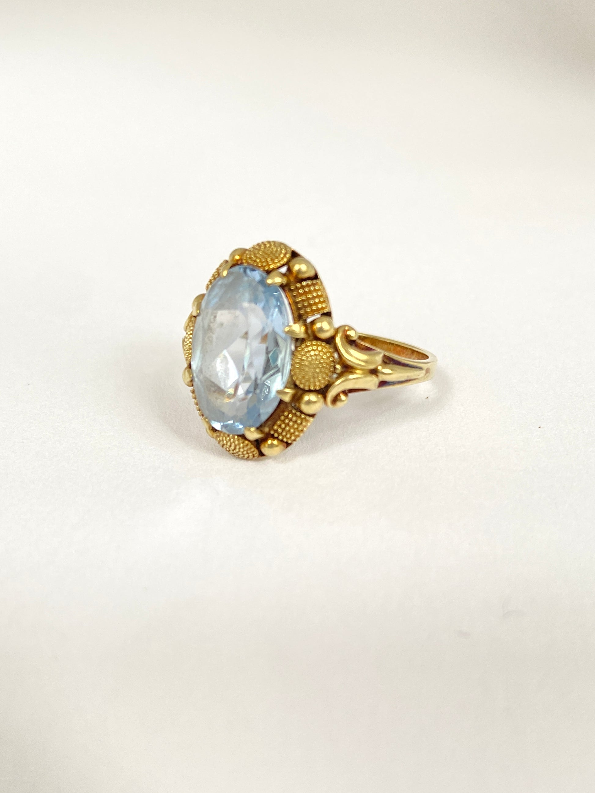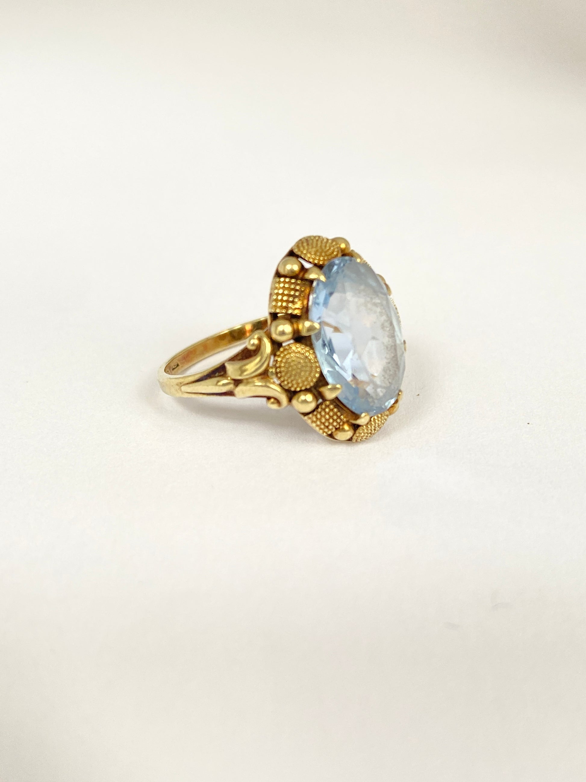 This beautiful vintage ring features a stunning blue topaz at its centre. It is beautifully translucent and its cut picks up the light beautifully. Its border lifts the stone above the finger, and provides some very unique and original gold work in the form of beaded squares and circles. I've never seen another ring quite like this one!