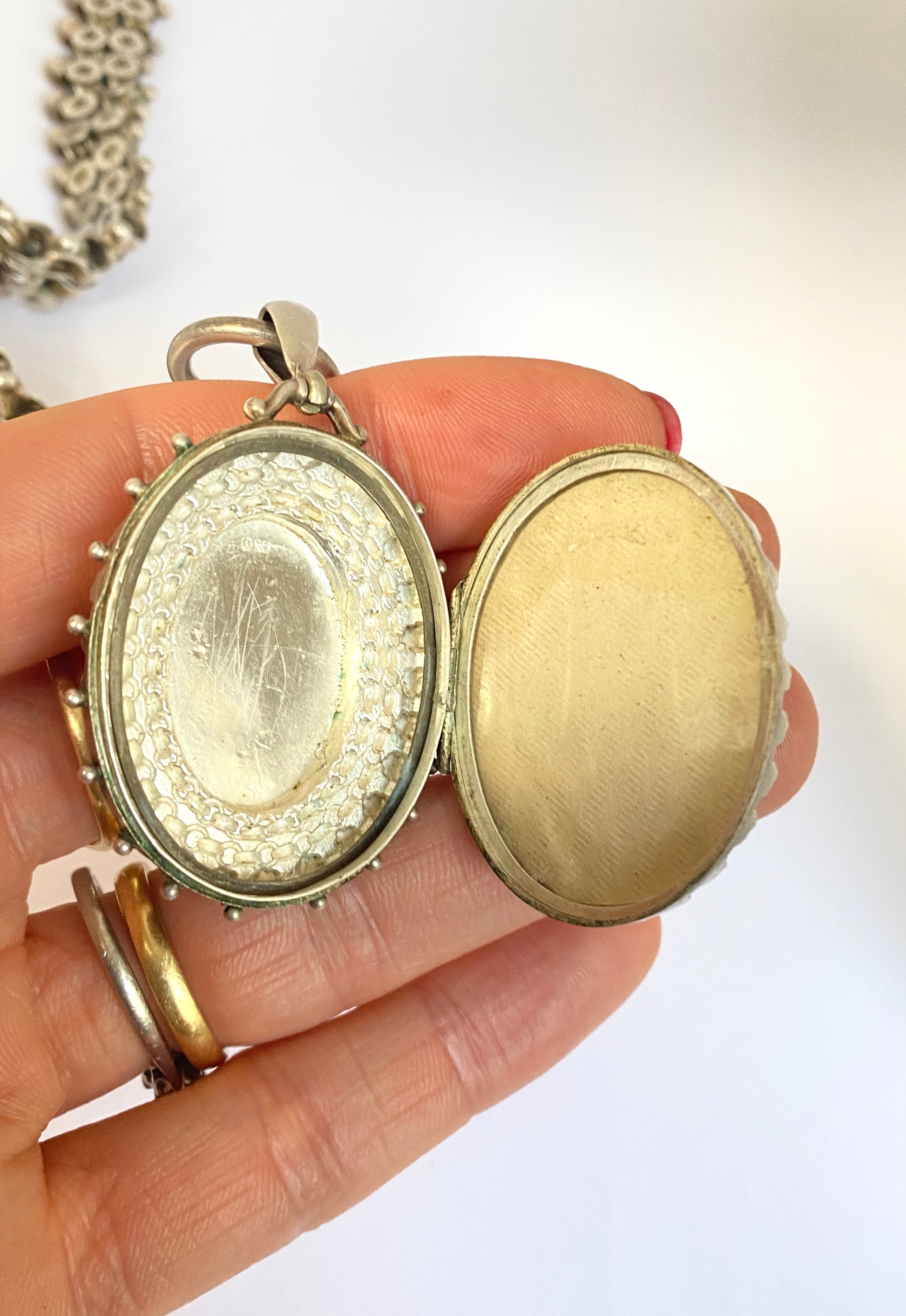 The locket is hallmarked on its reverse and features the same star links on its border, as well as a large horse shoe (meant to bring luck and fortune to the wearer) at its centre.