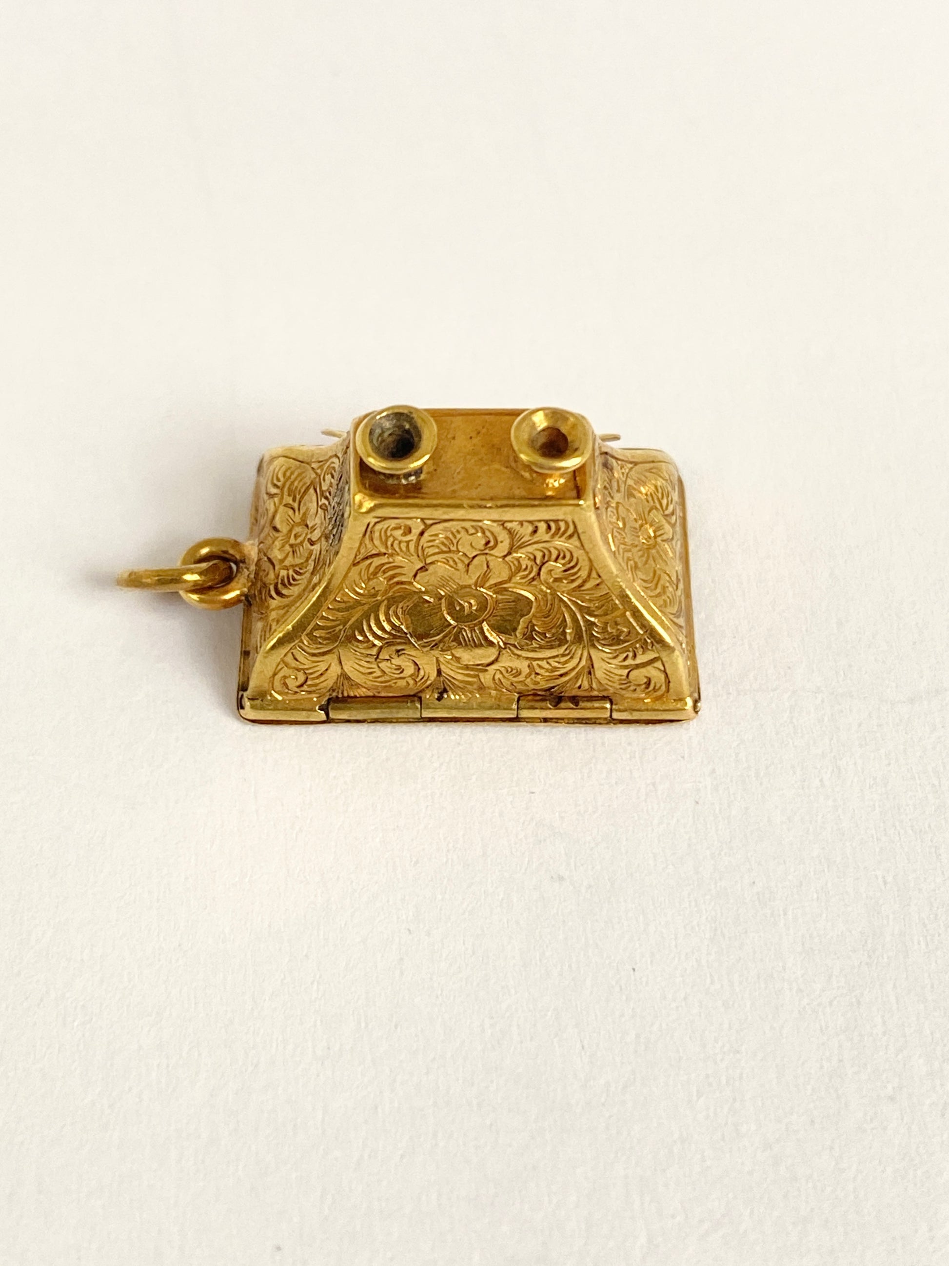 This stunning and unusual Victorian Vinaigrette is a real piece of history. Crafted from 18ct Gold, it features wonderful engraving over its entirety, a little compartment for the oils/perfume, and a door to open to release the aromas. Both lids open and close perfectly.