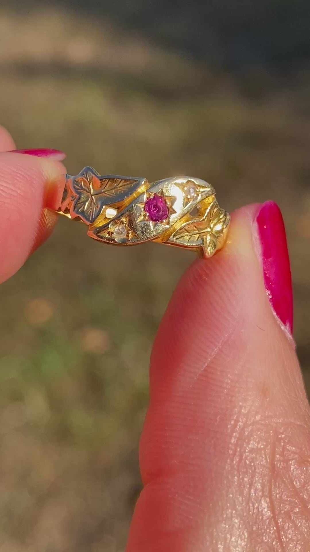 Victorian, 18ct Gold, Ruby and Diamond Ring Ivy Leaf Decoration, 1901