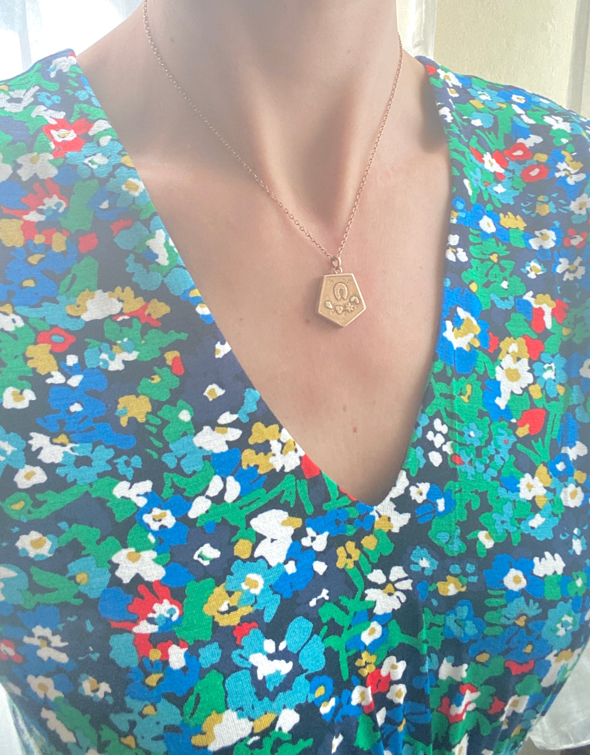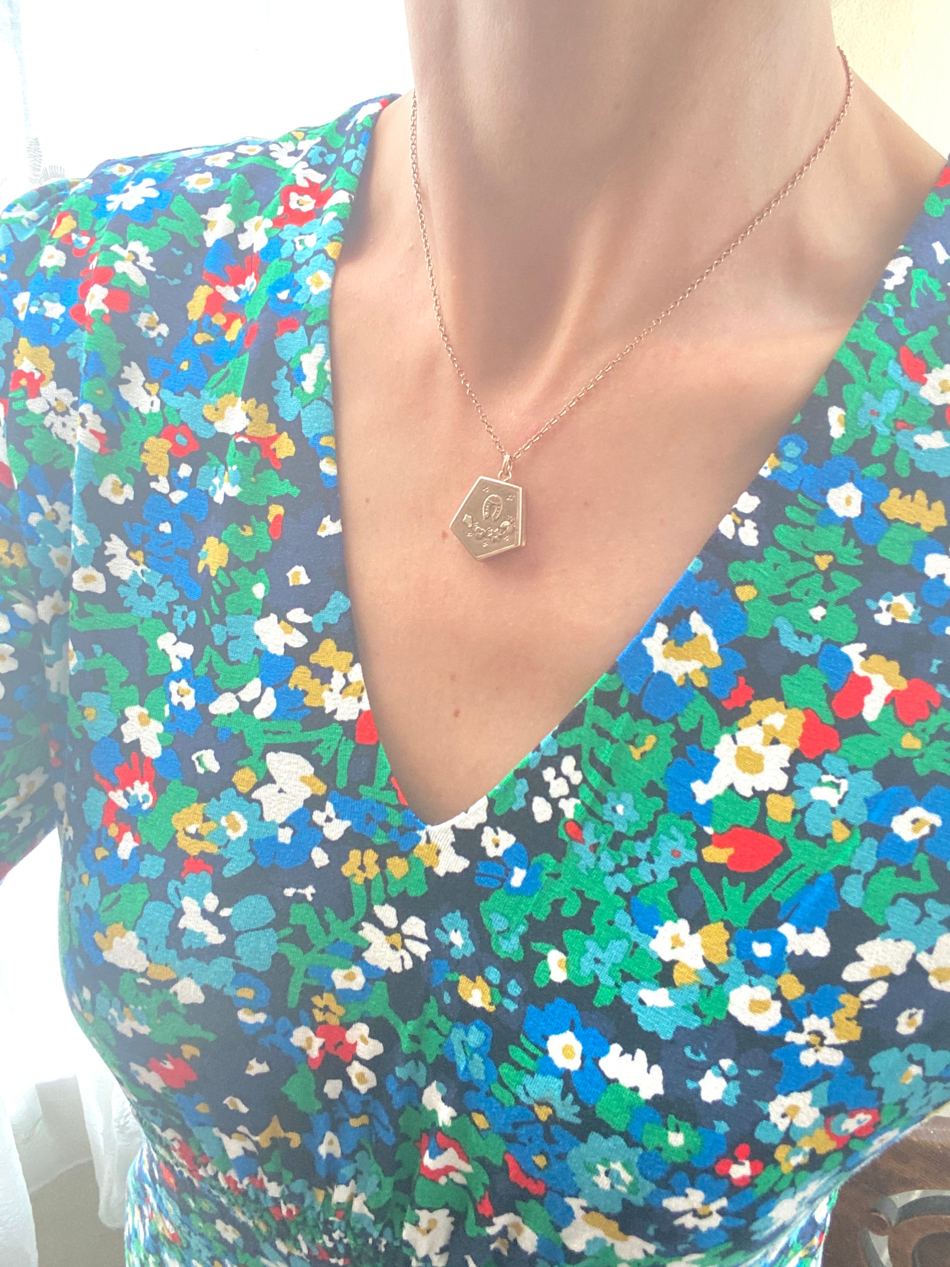 The locket features a very pretty and detailed horse shoe at its centre, and below it, an ivy leaf (cling to thee) a clover (luck) a star (guidance) and some other leaves in both rose and yellow gold.