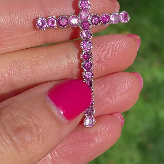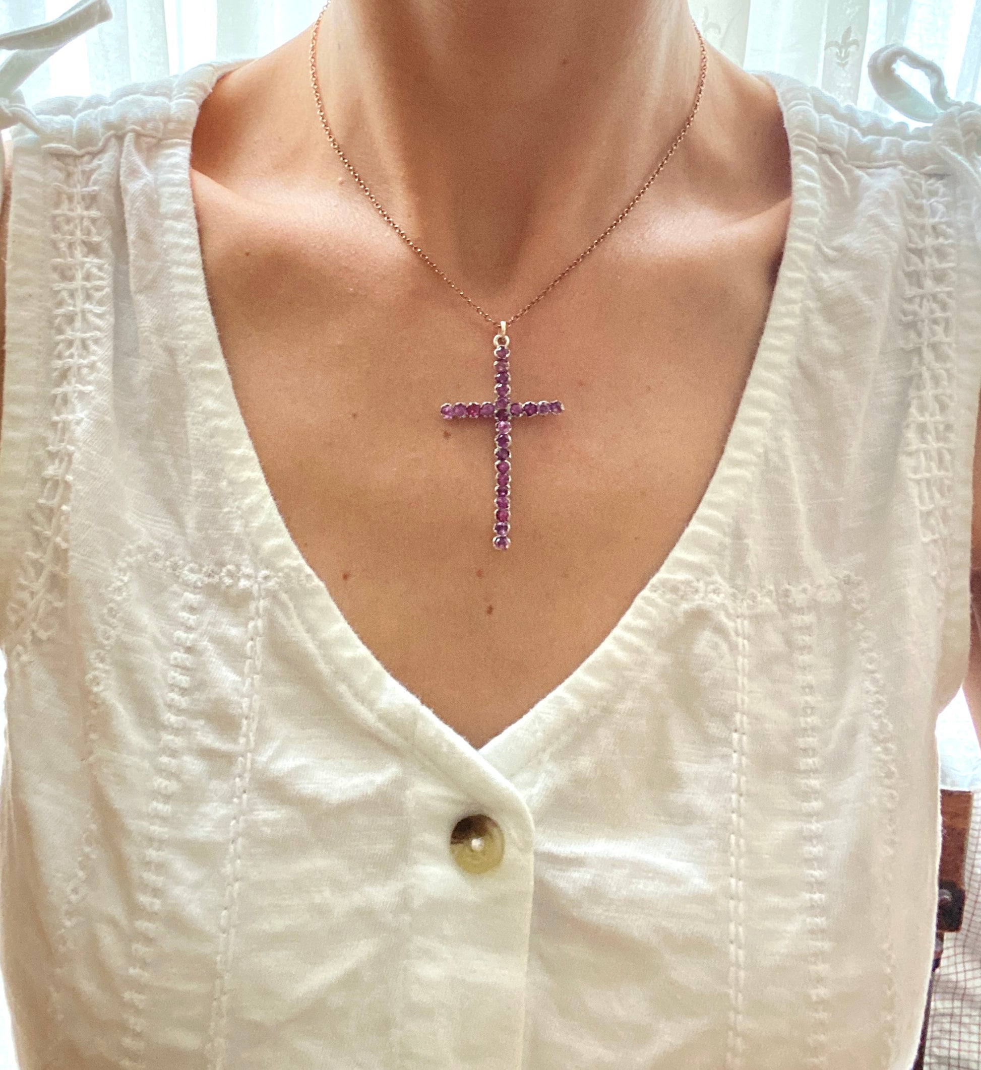 This beautifully made cross freatures 24 twinkling rhodelite garnets on its front, and a plain 9ct gold back. The front of the cross is crafted in silver, and the gems are held securely by silver claws.
