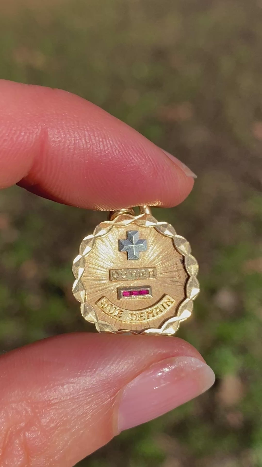 This romantic and difficult to find pendant/charm features pretty scalloped edging, a white gold plus sign, and three bezel set rubies in the minus sign. It measures approximately 1.7cm by 2cm (not including the bale) and it weighs 2.63g of solid 18ct gold. The french bale displays a clear french hallmark for 18ct Gold, the eagle's head and A.A. is present on the pendant's face.