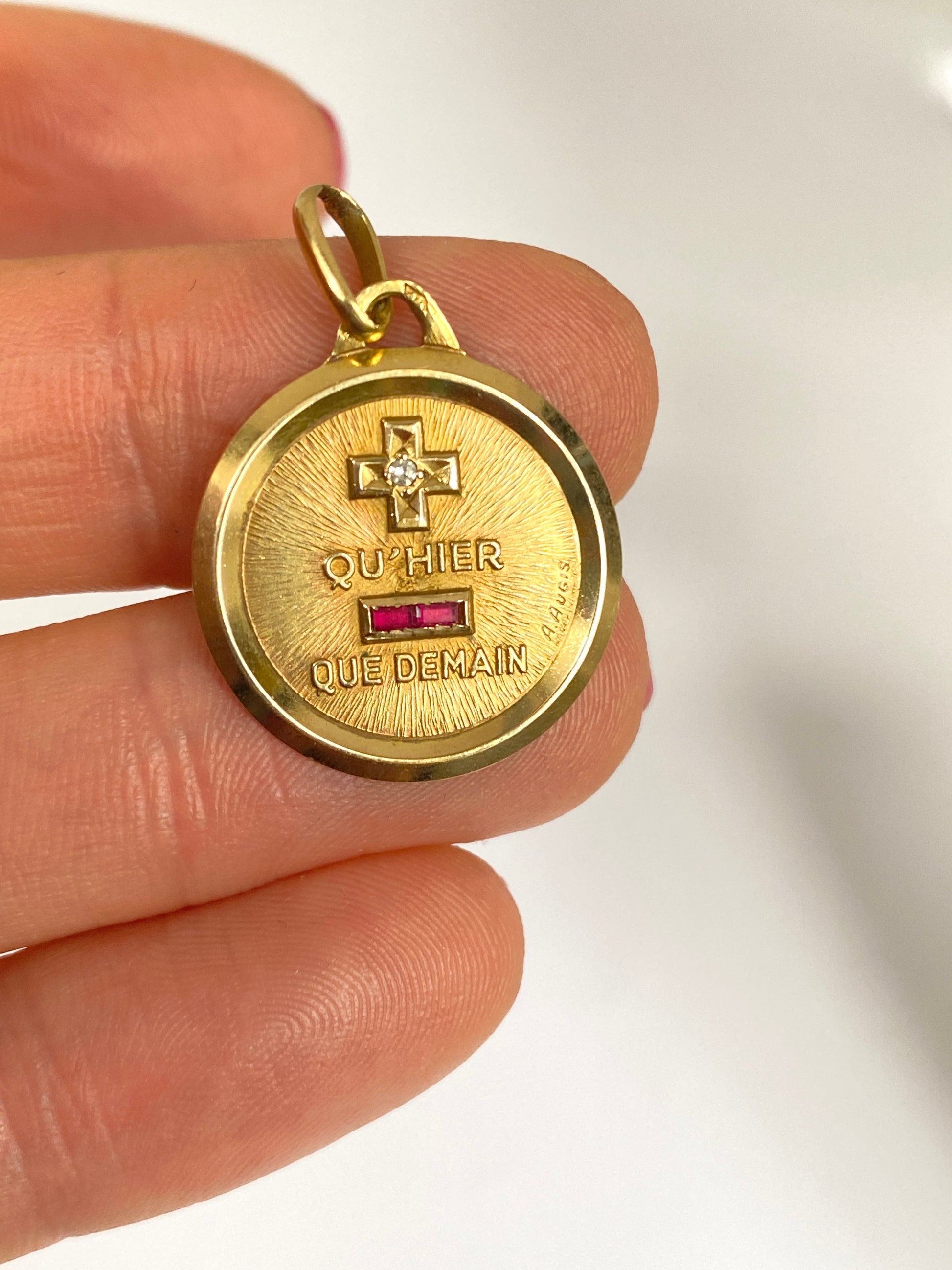 Vintage, 18ct Gold, Diamond and Ruby French Augis Love Pendant, 'Qu'hier - Que demain'