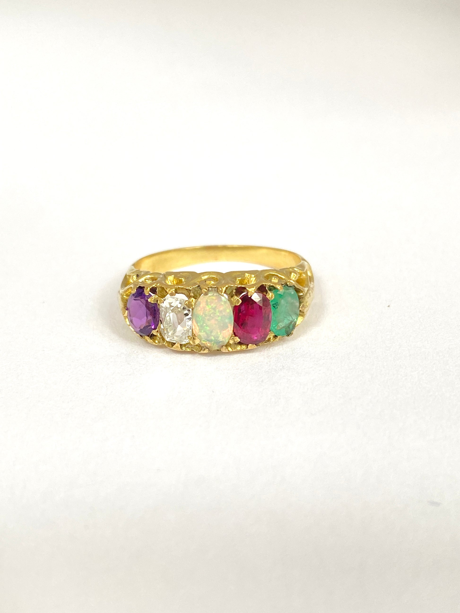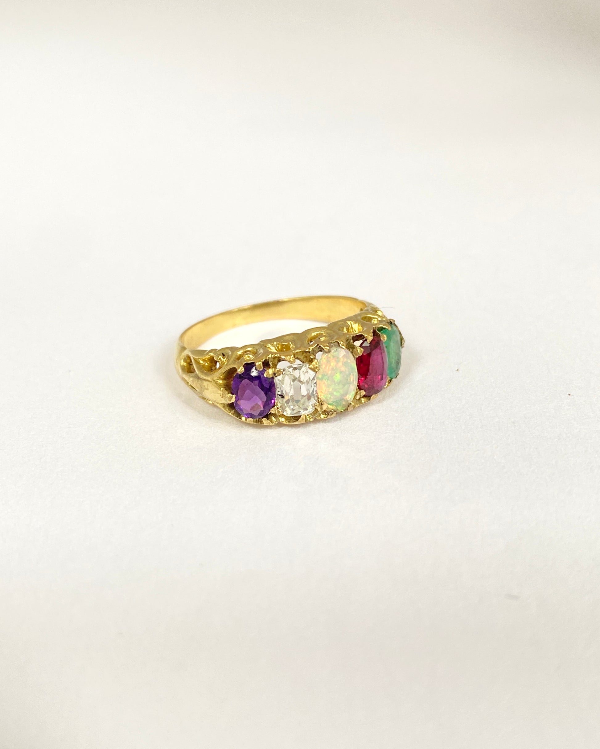 'Acrostic' rings have always been extremely popular and in Victorian times, were used to express a secret romantic message to their loved one spelt out in gemstones. This one let the wearer know that they were 'adored'.