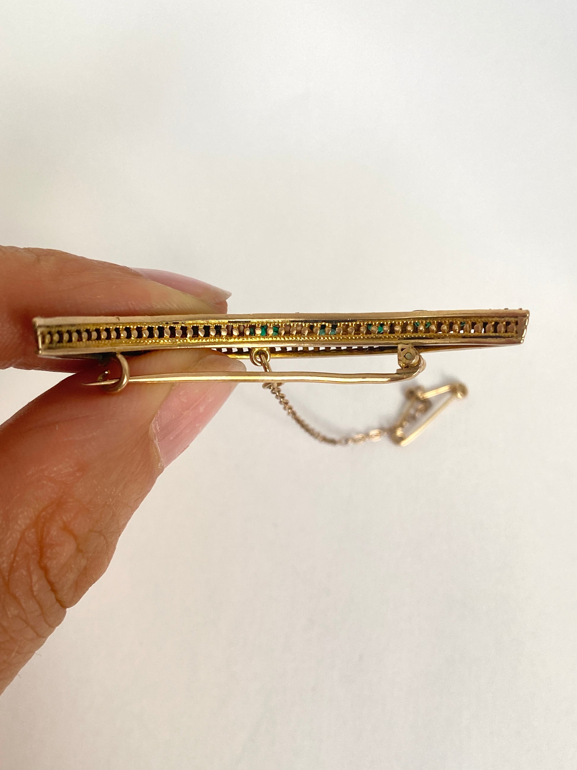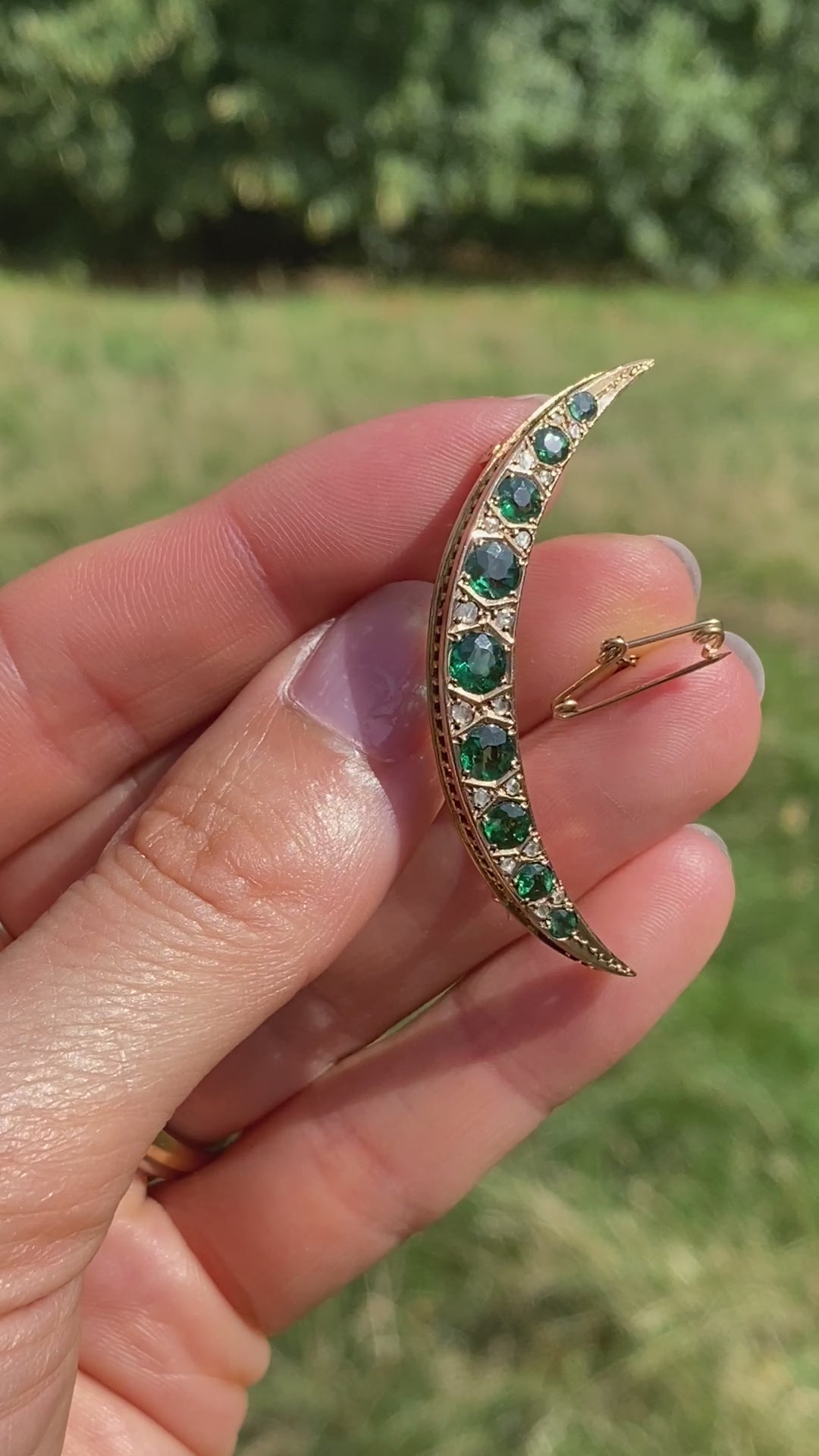This is a beautiful 9ct Gold Emerald Paste and Diamond Paste crescent moon brooch, complete with safety chain. It features 9 graduating emerald paste stones from top to bottom and 16 diamond paste stones, arranged in pairs between each green paste stone. Stunning gold work is detailed on both edges, adding to the wonderful detail and making this piece really unique.