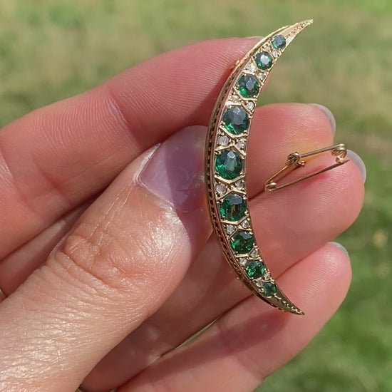 Vintage, 9ct Gold Emerald and Diamond Paste Crescent Moon Brooch