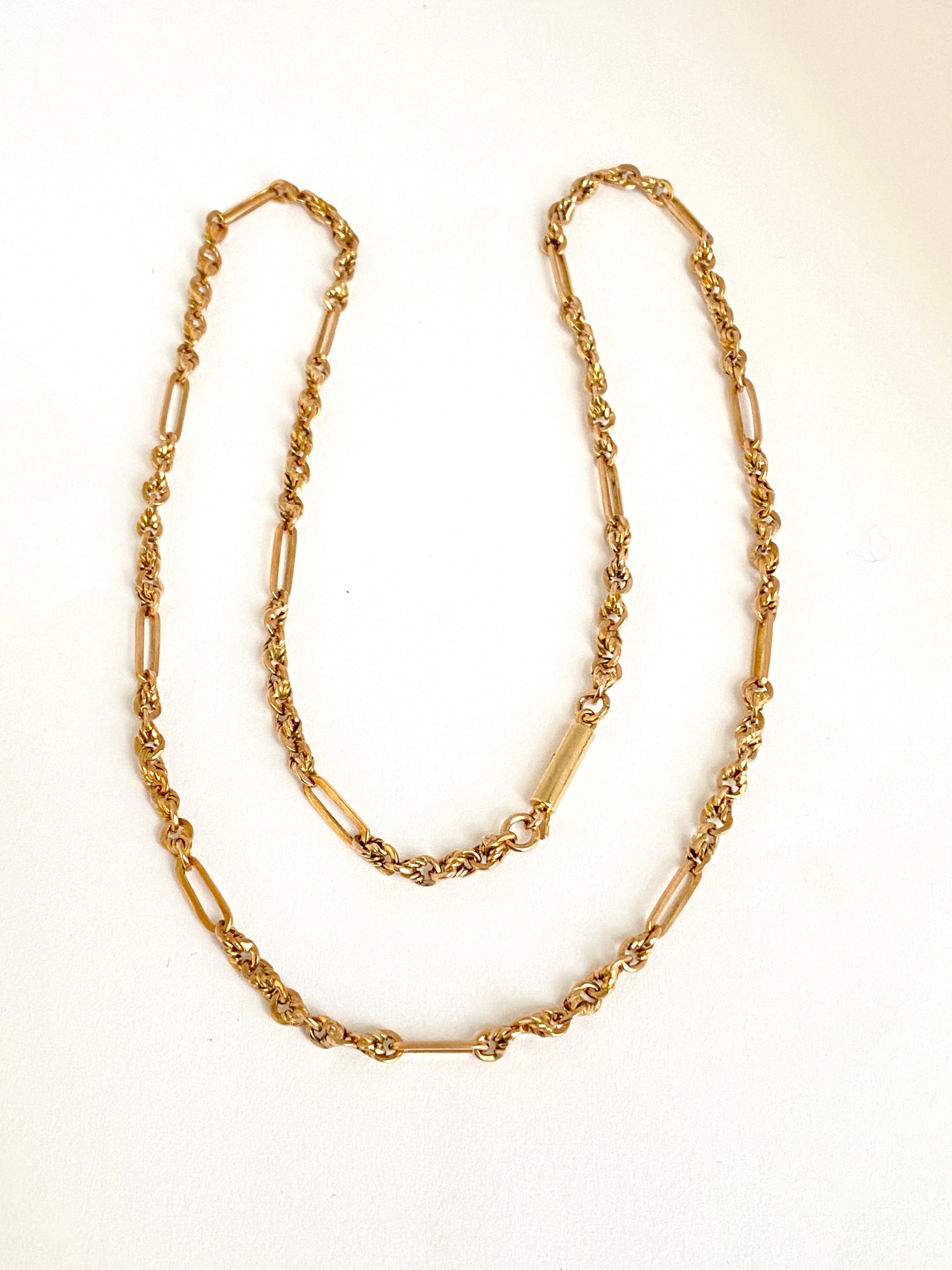 Solid gold chains have been a fashion staple for over a century, and at this lovely length, they are highly sought after. Their versitility means they can be worn alone, in a stack with longer or shorter chains. This one, with its fancy links, looks fantastic on its own, but could also be worn as part of a stack.