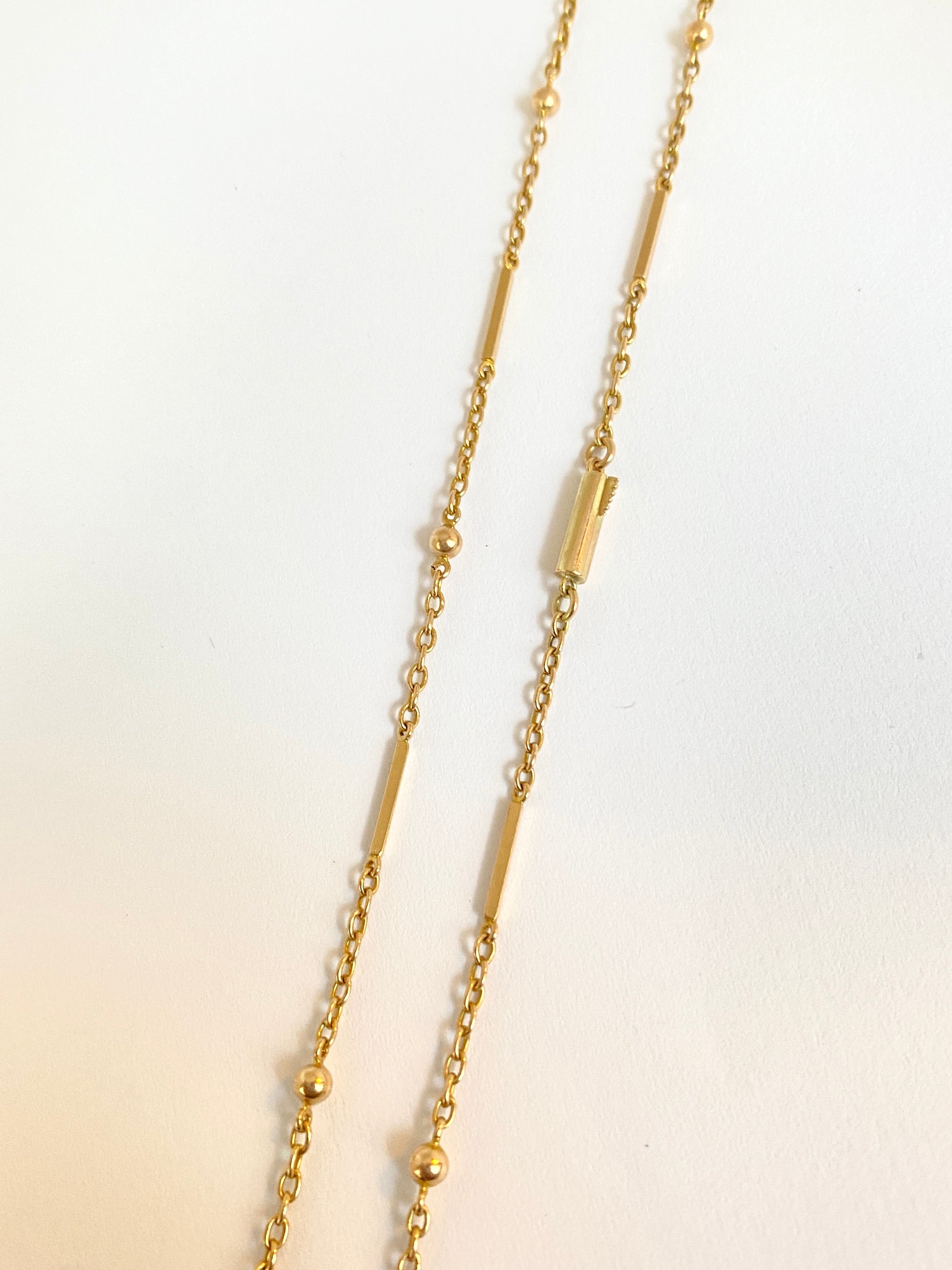 This beautiful 9ct gold chain dates from the 1920s and has lovely fancy links comprised of bar and bobble stations. They create some lovely texture and catch the light as the chain moves. The chain closes securely and weighs 3.84g. It measures approximately 16 inches long and is 2mm wide.