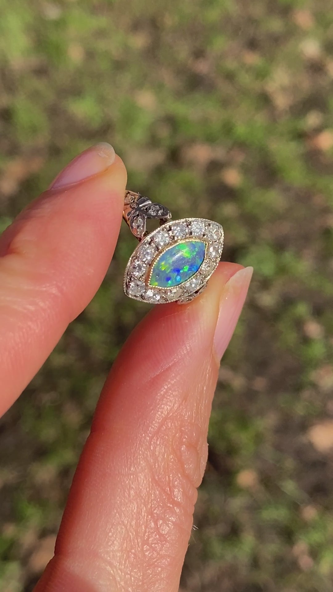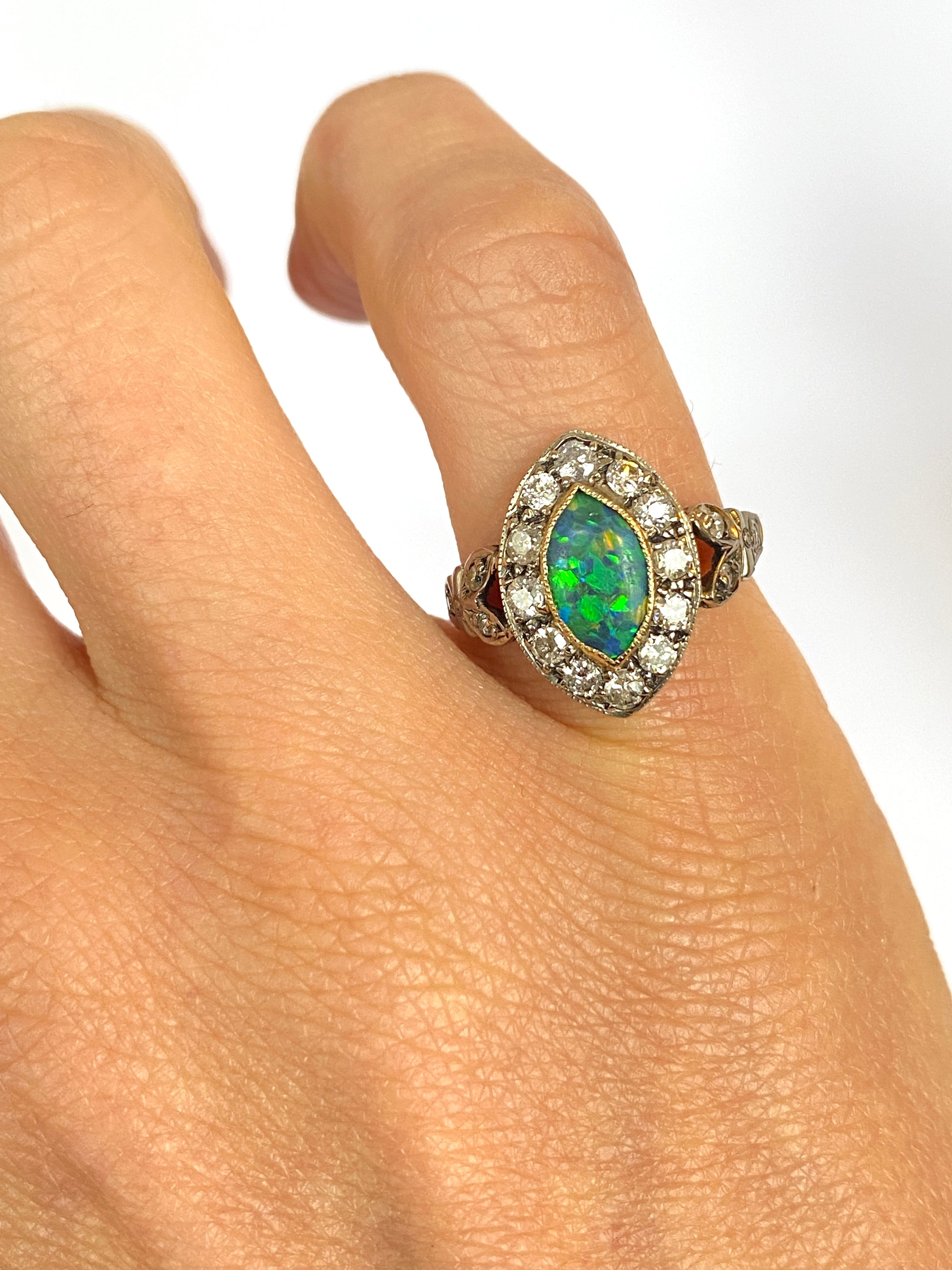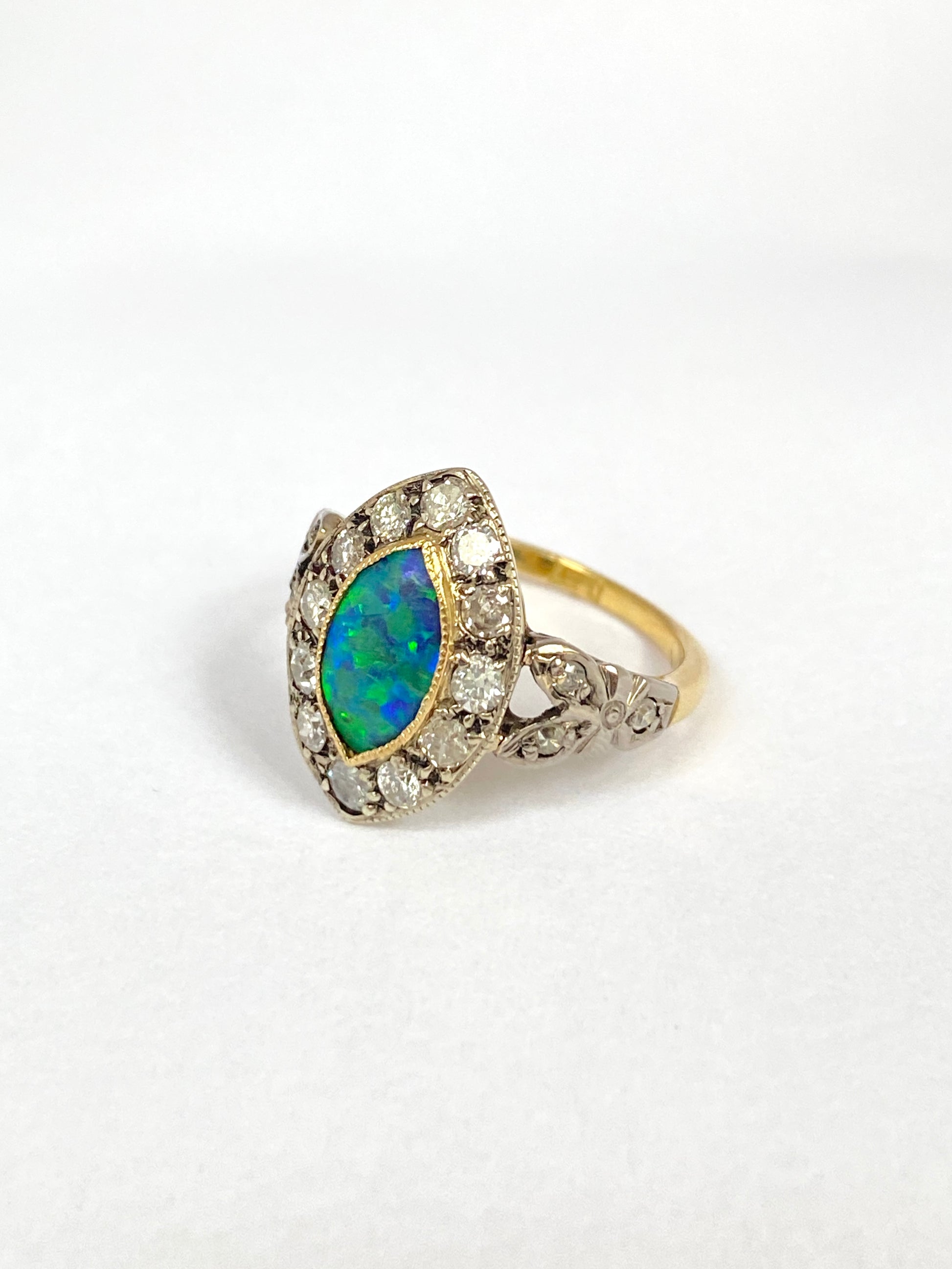 This beautiful showstopper of a ring features a fiery and multicolour changing oval Opal Doublet in a platinum setting, on a 18ct gold band. (an opal doublet is an opal sanwiched with a dark coloured backing, which enhances the color's vibrancy.) In almost any light, you will see a real kaleidoscope of colors on this gem; sparks of purple, green and blue lit by a bright orange and pink fire. This incredible gemstone is is surrounded by a thin gold border, which in turn is haloed by a mixture of 12 lively old mine cut and round cut diamonds. Two further diamonds sit on each split shoulder which are beautifully designed as leaves.