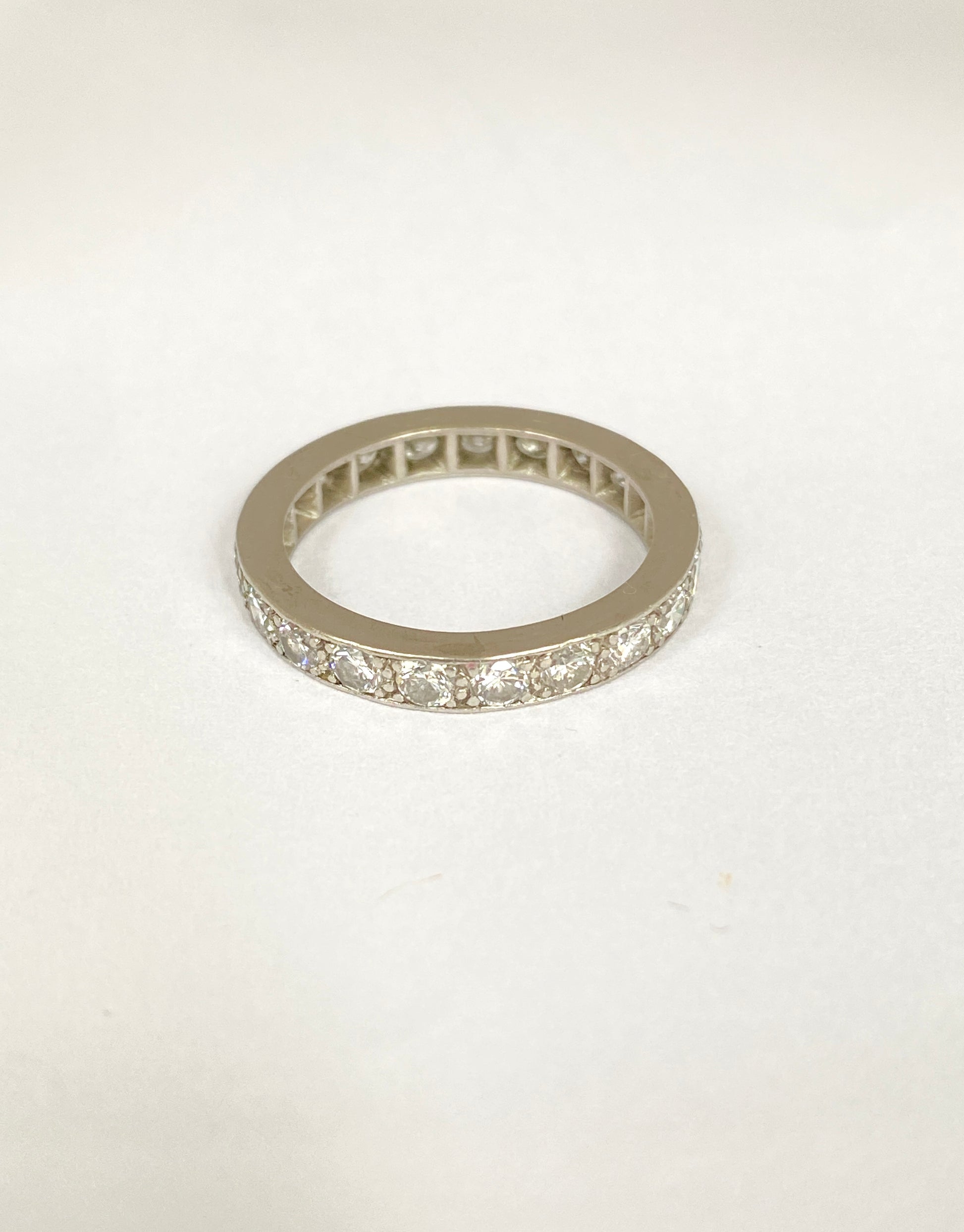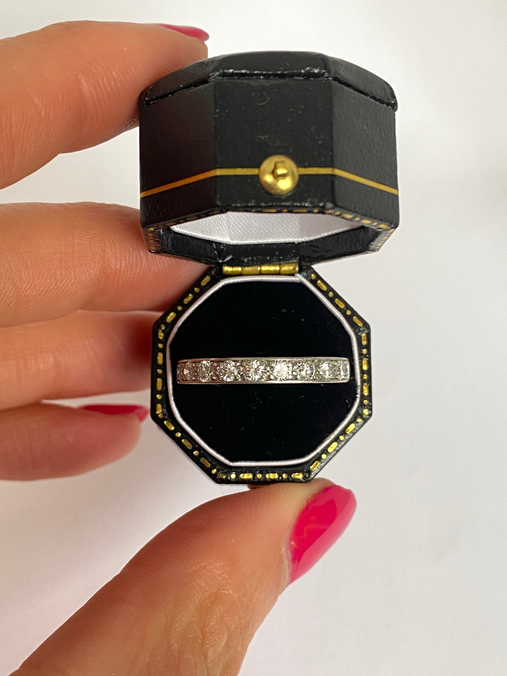 This is a truly exceptional, eternity ring which features a full diamond band, featuring 21 very good sized sparkling antique diamonds of on a platinum band. The diamonds on this ring, the band of which measures approximatey 4mm catch the light beautifully.