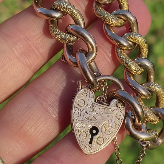 9ct Gold, Victorian Chased Bracelet with Engraved Heart Padlock Clasp, 23g and 7 inches