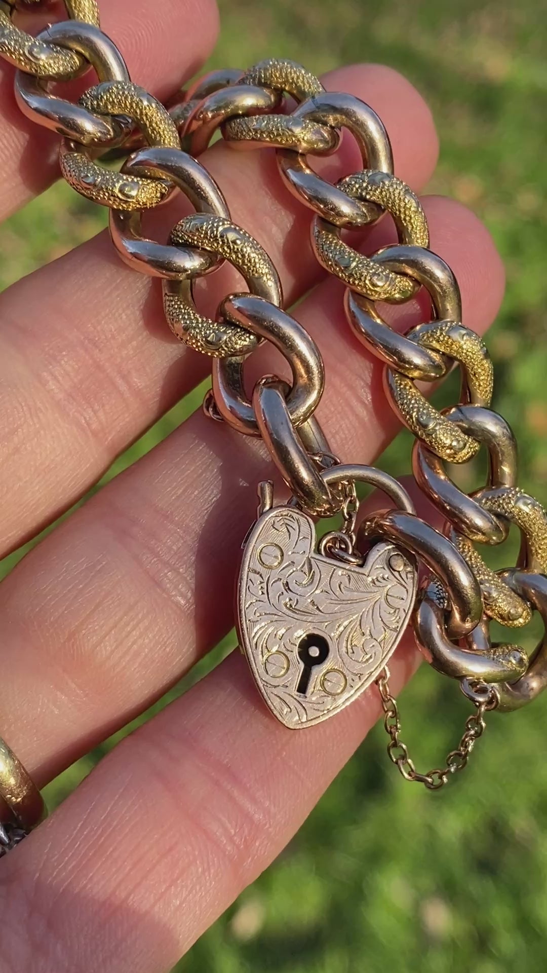 On one side of this classical curb bracelet, there are alternating engraved and plain links all the way round. On the other side, the hollow links are plain aside from the gold hallmarks which are present on each link. The Victorians called bracelets decorated like this "Night & Day” bracelets as they were reversible and could be worn with for night or daywear. The plain side was worn during the day and then it was turned over to its chased side for evening wear. The fashion for these bracelets has continued from Victorian times right through to the 21st Century where they remain a classic and iconic piece for many women today.